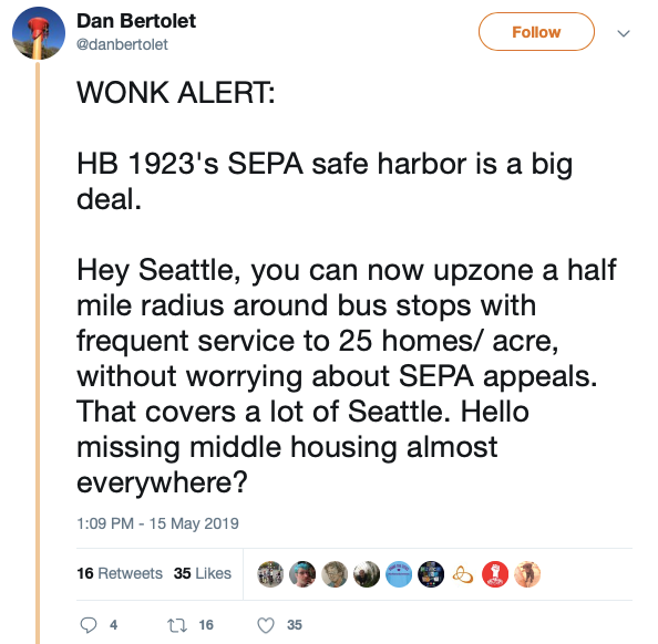 That was certainly not what SEPA’s creators hoped its legacy would be almost fifty years on, and it is why some local environmental leaders, including Seattle Councilmember Mike O’Brien have expressed enthusiasm for state level legislation passed earlier this year in House Bill 1923, which provides cities with a menu of options for increasing their housing density and then provides “safe harbor,” or protections from SEPA lawsuits, for actions taken from that menu.