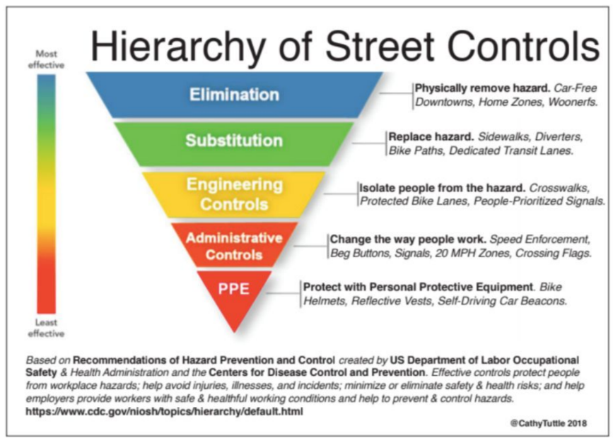 For the past few years, after being the director of Seattle Neighborhood Greenways, I was hired as a consultant by departments of public health in several US cities that had experienced high levels of pedestrian fatalities. My emphasis is not on teaching drivers to be civil, or getting police to give more speeding tickets. It is street engineering to improve the way people naturally use roads. Engineering improvements that include lane width narrowing, leading pedestrian signals, better signal timing, road rechannelization (road diets), curb extensions, barrier protected bike lanes, speed bump. Vision Zero is a product safety program. This week, I have a paper that is being given in Dublin at the VeloCity conference. A Seattle public health nurse, Merlin Rainwater, is giving it on my behalf. Here’s a graphic from the paper.