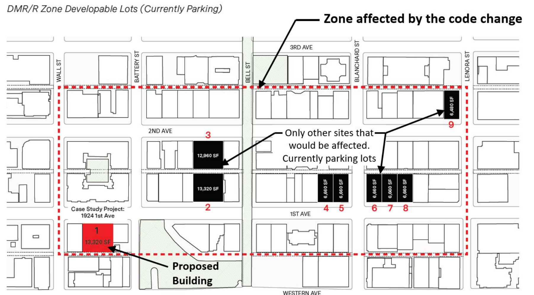 In Belltown, the mayor sought a rezone on First Avenue and Second Avenue between Wall Street and Lenora Street with the goal of allowing hotel uses. The rezone area covers about eight blocks and has nine vacant properties currently used as surface parking lots. Most of them are large enough to support development of larger structures.
