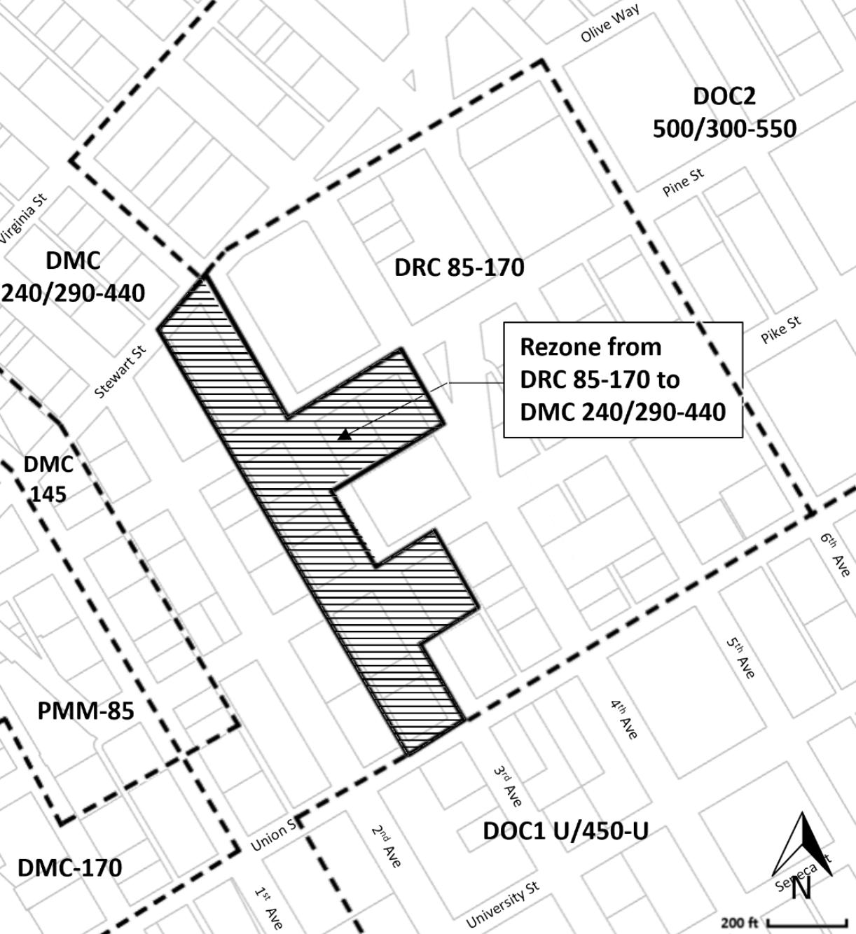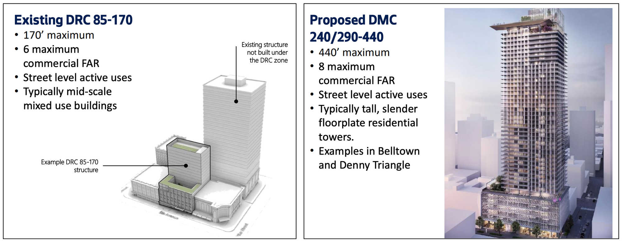 The rezone is designed to achieve two principal goals: a lot more housing and incentives for a new downtown school. DRC 85-170 zoning on area blocks will be replaced with DMC 240/290-440, which allows for several hundred feet more in building height and heavily geared toward residential uses. Sweetening the rezone is a reduced tower spacing requirement, going from 200 feet to just 60 feet, and higher floor area ratio (FAR) limits for non-residential uses. That is the kind of zoning attractive to developers in the mixed-use business.