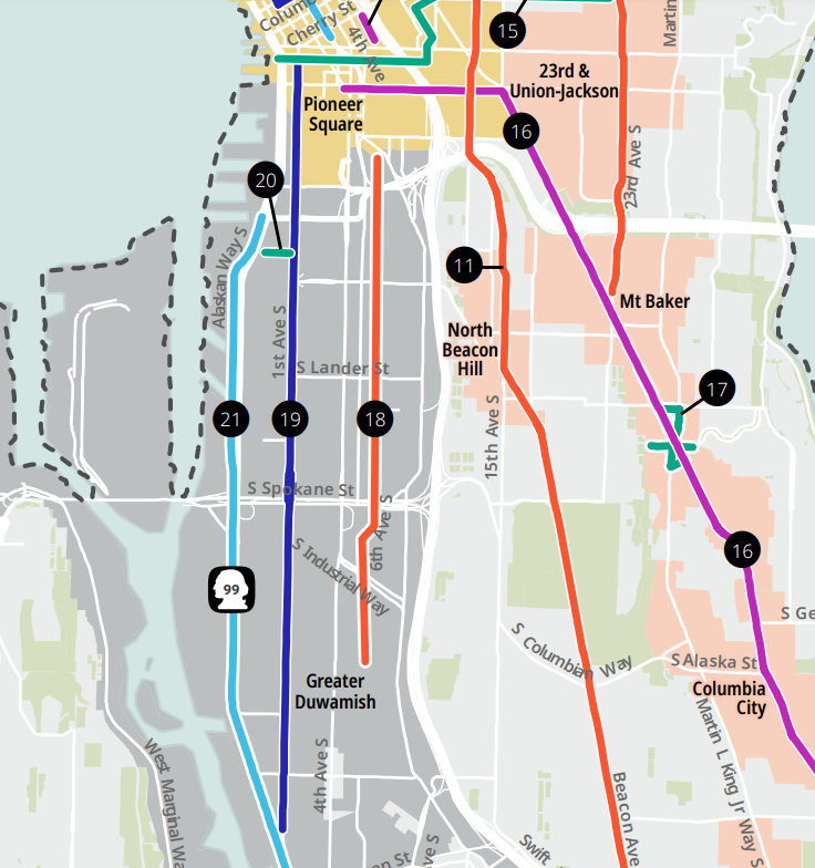 The laundry list of projects developed for the city council’s impact fee proposal includes a number of multimodal corridor projects, like upgrading Lake City Way, Rainier Avenue, or Jackson Street into a “complete street” — though it’s not exactly clear what that means. It also includes multiple projects aimed directly at increasing freight and general-purpose vehicle capacity, including expansion of city streets around the I-5 ramps at 6th Avenue, truck improvements to S Massachusetts Street in SoDo, and vague improvements to First Avenue through Downtown and SoDo.