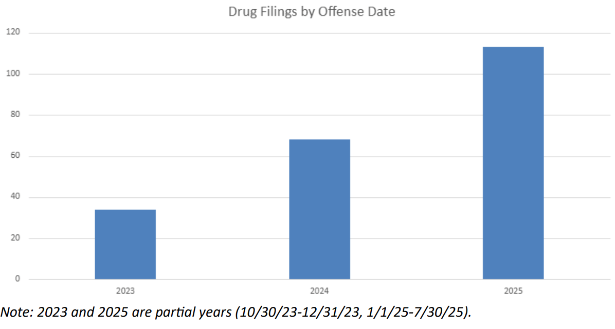 The DPD analysis of the drug ordinance found that related prosecutions have increased in 2025. This year through the end of July 2025, the Seattle City Attorney’s Office (CAO) filed nearly double the number of cases related to violations of the drug ordinance compared to the entire previous year. In 2025 the office also increased the pace on prosecuting older cases from 2024.