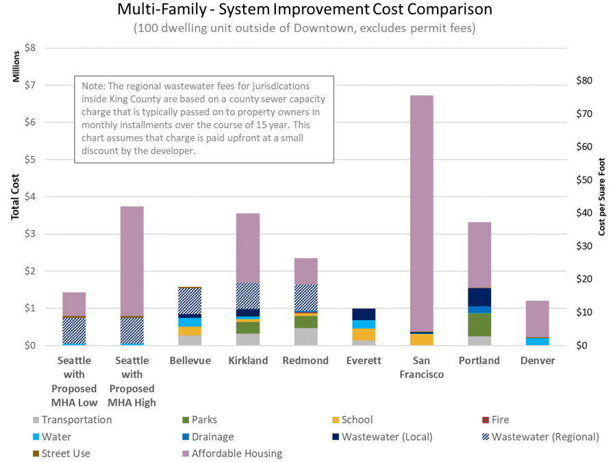 Transportation impact fees are just one part of overall system improvements (e.g., parks, emergency service facilities, child care, affordable housing, and water and sewer connection contributions) that developers are often responsible. Looking at the wider range of obligations, Breiland highlighted how Seattle compares to peer and regional cities when it comes to a range of system improvement types. She illustrated this through three hypothetical development scenarios (e.g., medium single-family home, large multifamily development, and large office development) and their system improvement responsibilities. Seattle stacks up toward the lower-middle of the pack and at the very bottom for single-family homes when excluding sewer connections.