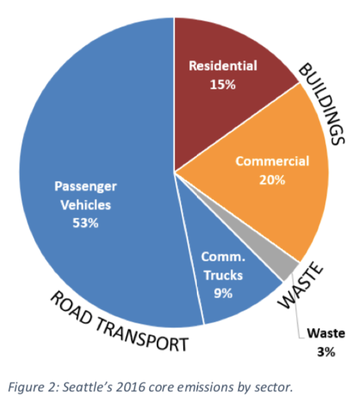 While Seattle’s City Council adopted a Climate Action Plan in 2013, the City has continued to fail to meet its carbon emission reduction targets. The most recent report released by the Office of Sustainability and Environment found that Seattle’s carbon emissions increased by 0.6% between 2014 and 2016. Citing population growth, the City touted these numbers as a win; however, it’s clear that if Seattle wants to remain an environmental leader, the City will need to commit itself to more robust outcomes in emission reduction, particular in the area of vehicle and building emissions.