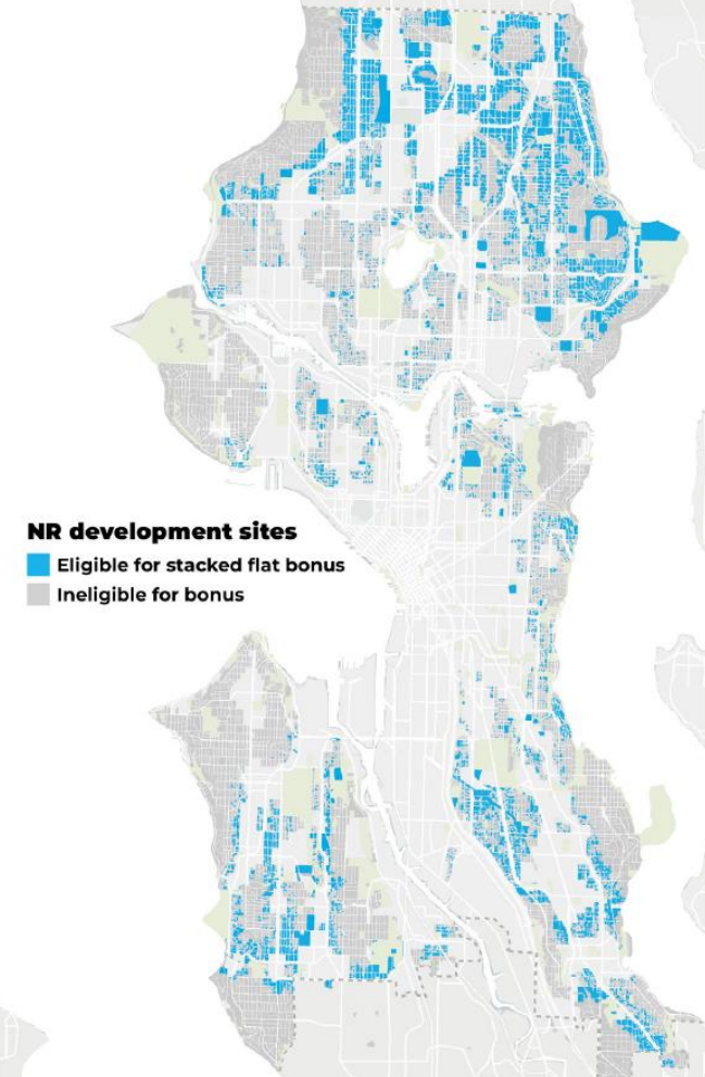 A major theme within amendments is potential tweaks that provide density incentives for building specific types of housing. Numerous councilmembers put forward incentives for stacked flats, modifying the proposed density bonus proposed by the Harrell Administration that would have applied to lots exceeding 6,000 square feet if builders stack units on top of each other. As it stands, the proposed stacked flat bonus would mostly have applied to lots in the city’s far north and far south, leaving out many areas close to frequent transit and major amenities.
