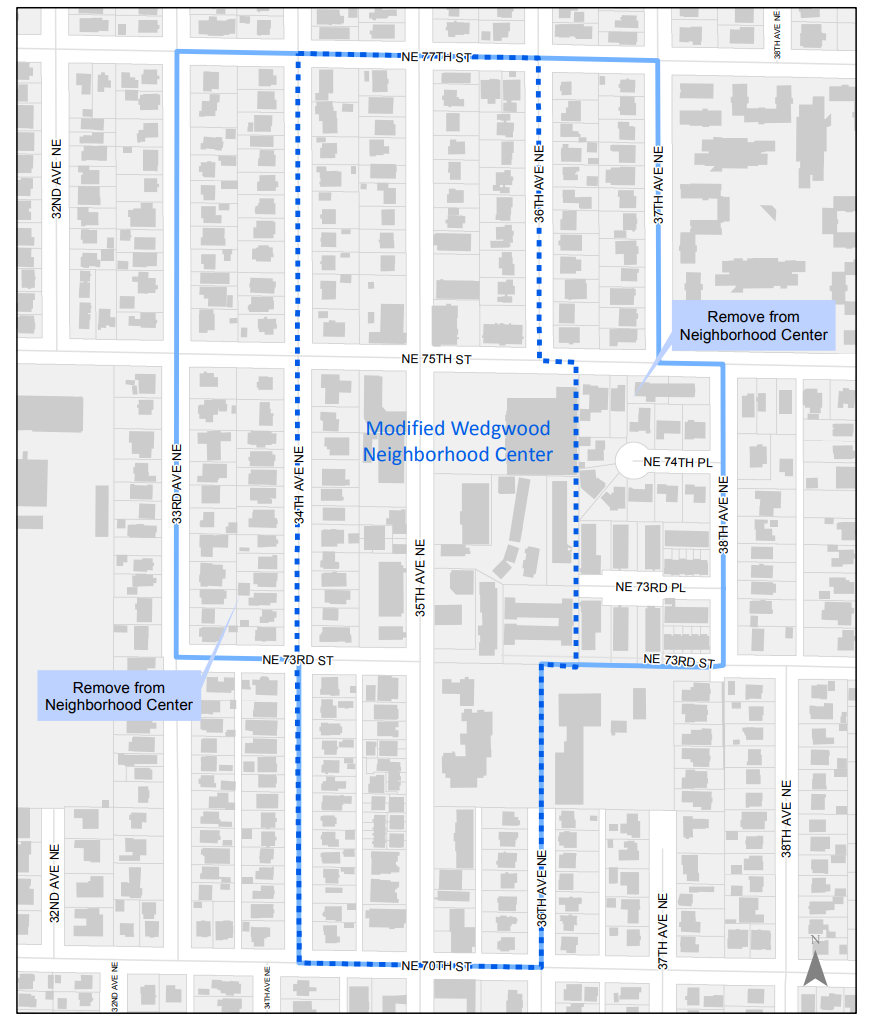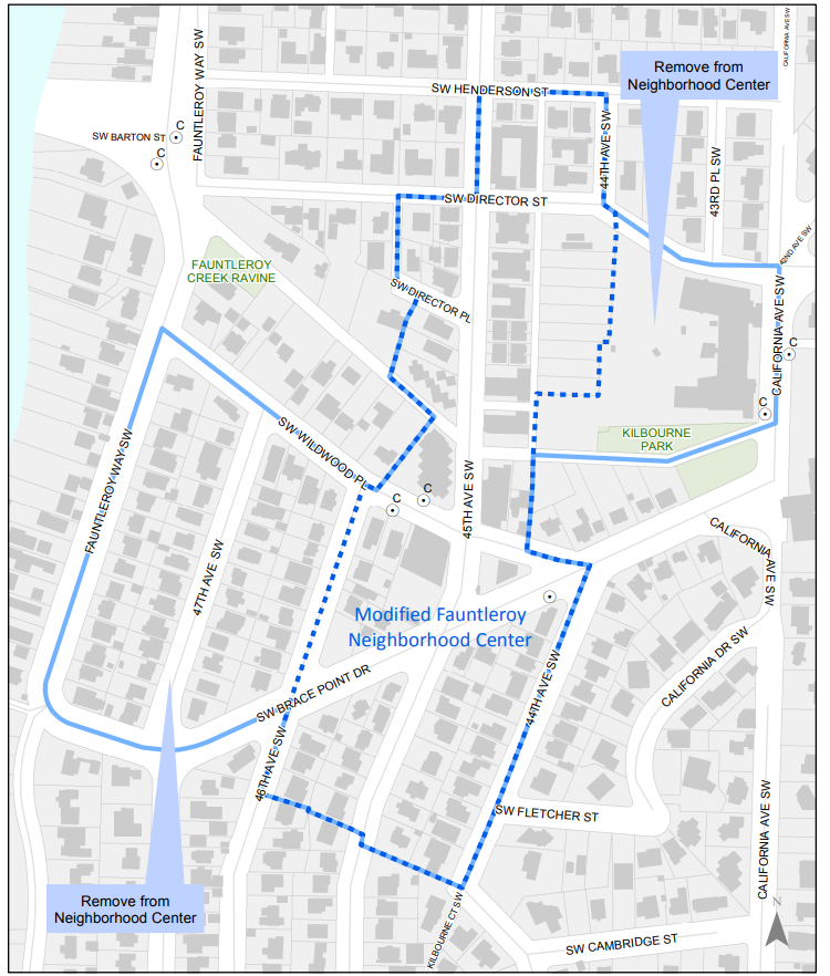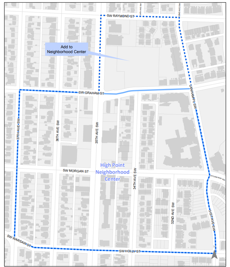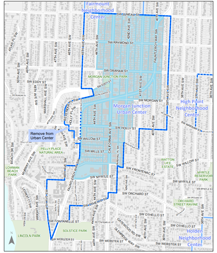 Saka responded by proposing a removal of two large blocks from the center, shrinking the potential of the new center to create a new neighborhood around the existing small business district. Additionally, he proposed to scale back the proposed expansion of the Morgan Junction urban center by around one block, and to expand the High Point neighborhood center by one block.