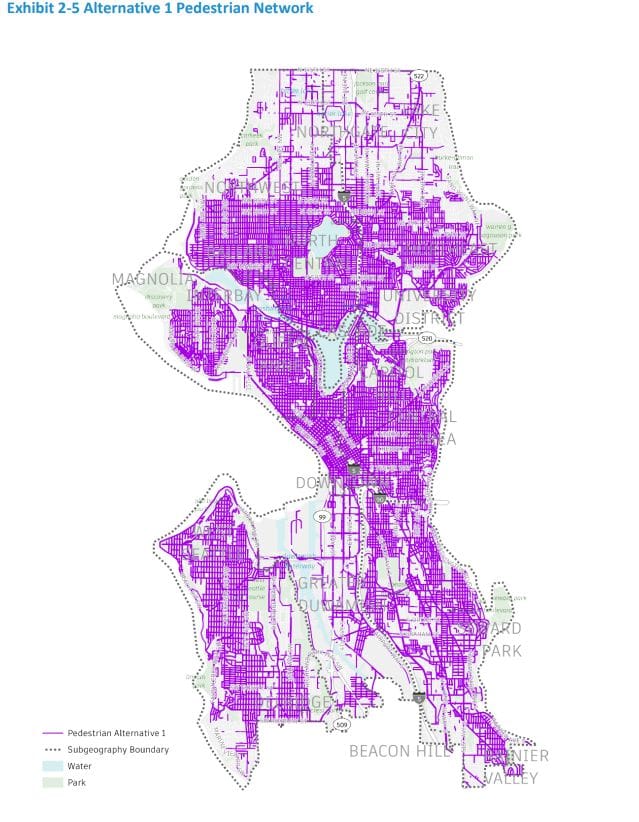 - Alternative 3 – Rapid Progress: “Alternative 3 focuses on the expansion of Seattle’s pedestrian, bicycle, and transit connections. The pedestrian network increases by 848 linear miles of sidewalks, the bicycle network adds 385 miles with facilities, an additional 76 miles of streets receive additional PSPS improvements, and an additional 123 miles are dedicated as transit corridors. In this alternative, the City fully implements overarching policies of the Seattle Transportation Plan with a greater expansion of PSPS, electrification infrastructure, a wider range of community and mobility hubs, and mobility management strategies in concert with the region. The existing freight network is expanded to include 19 miles of shared freight- and- bus (FAB) lanes.”
