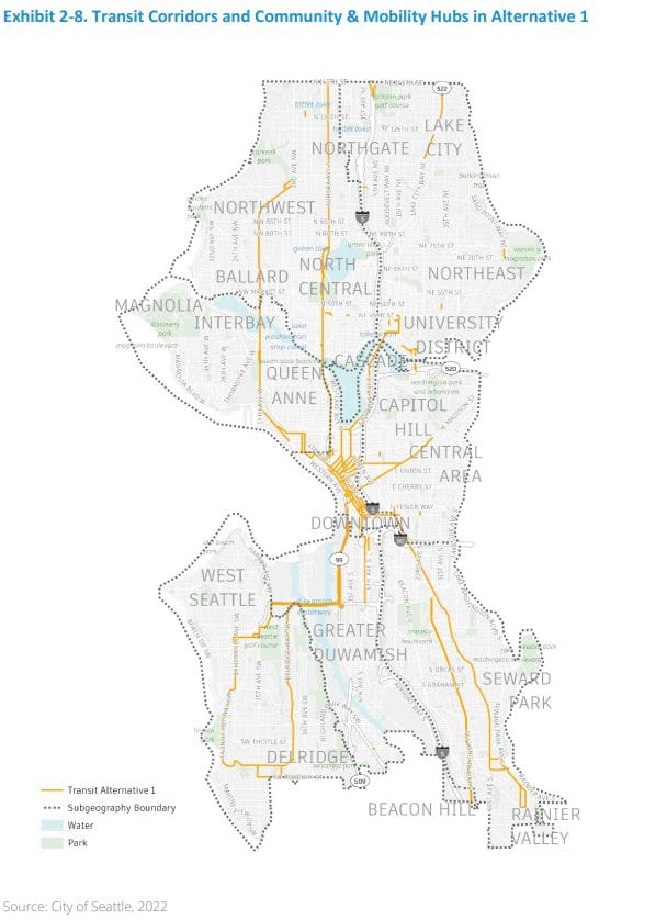 “Overall, Alternative 3 represents the most comprehensive and transformative approach to improving the City’s transportation network and is most supportive of broad changes to the land use pattern,” the City wrote. “Transit system improvements are also the most frequent, with the most dedicated transit corridors, light rail stations, and RapidRide corridors. This alternative introduces more EV charging infrastructure required in new development and additional EV infrastructure in public streets. These improvements create the most access to community assets in areas of the city beyond frequent transit corridors and outside of urban village/urban center boundaries.”