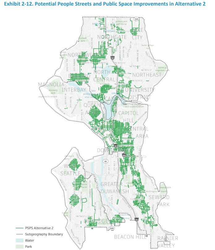 However, SDOT’s Alternative 3 is also less bold than an existing crowd-sourced plan that advocacy group, Seattle Neighborhood Greenways, released in 2020 with 130 miles of pedestrianized people streets to stitch a network across the city.