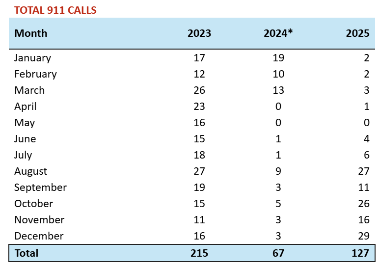 Library spokesperson Laura Gentry said the uptick in calls in late 2025 stemmed from a change in reporting procedures that logs patron calls, not just staff calls: “We did a deep dive analysis of the Q4 2025 incident reports involving 911, and the uptick appears to be related to additional data gathering of 911 calls made by patrons themselves for various reasons, something we did not capture in 2023.”