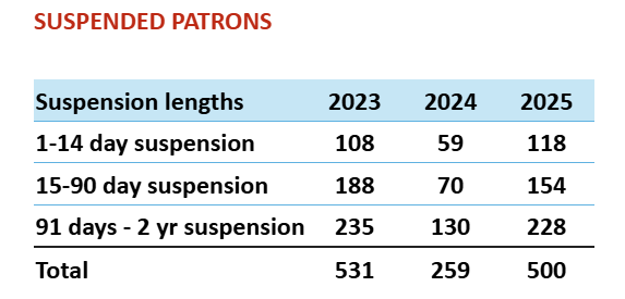 “When Library staff call 911 for SPD assistance to resolve an incident with a patron, SPD typically issues the patron a one-year trespass and it then becomes a crime for the patron to return to the Library during that one-year period,” library leadership wrote on their blog, following publication of this article. “When SPD issues a one-year trespass, the Library issues a corresponding one-year suspension. This was a recent adjustment made to reduce confusion between trespass vs. suspension lengths, which were previously out of alignment.”