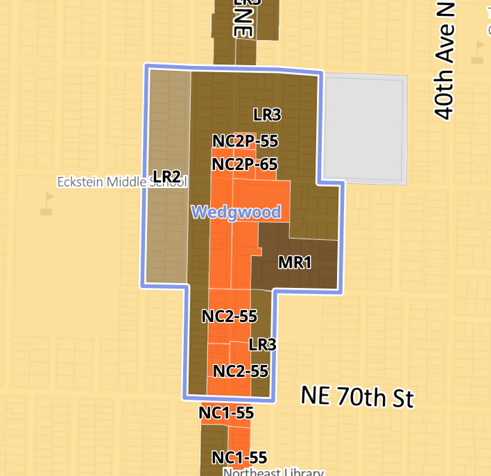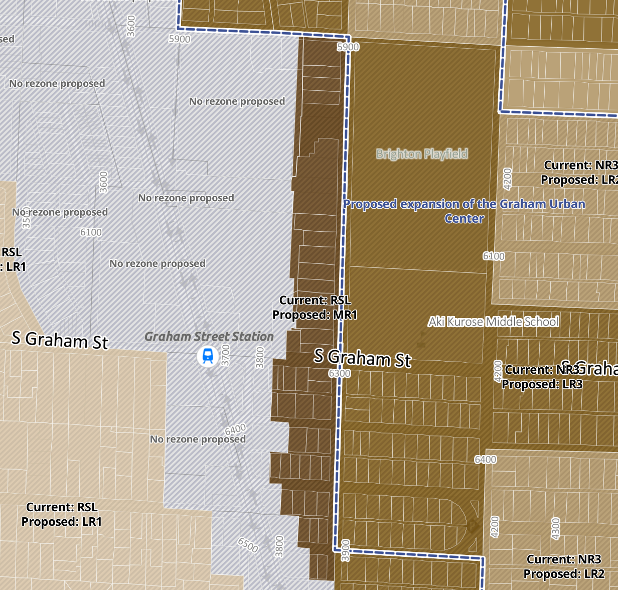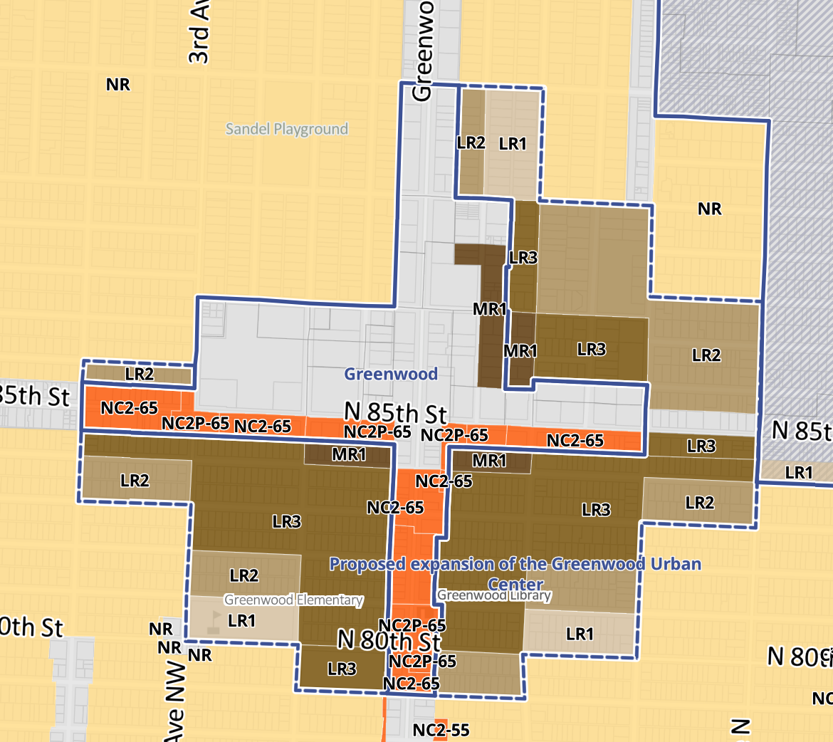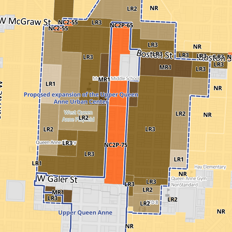 Separately, OPCD is proposing to upzone various pockets of the proposed Uptown Regional Center expansion area, Greenwood, Central District, Graham, Upper Queen Anne Urban Center expansion areas, and new Upper Fremont, Madison Valley, Bryant, Mid Beacon Hill, and Wedgwood Neighborhood Centers to MR1.