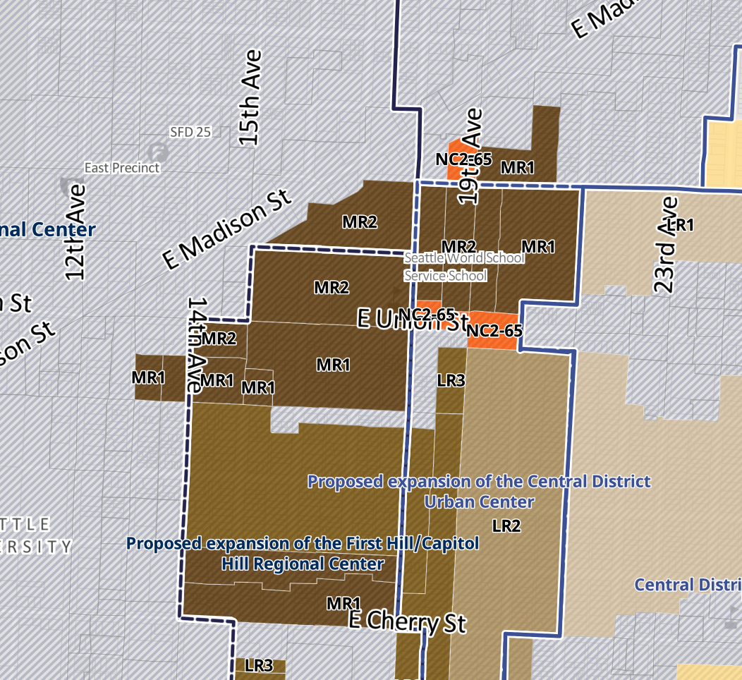 Existing urban centers are the most common areas proposed to get MR1 and MR2 zones. Those existing MR zones would be upzoned to MR2 zones and three locations outside them could also see the zone type. Those include pockets of the expanded First Hill/Capitol Hill Regional Center and Pinehurst-Haller Lake and Central District Urban Centers.