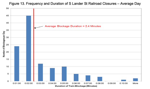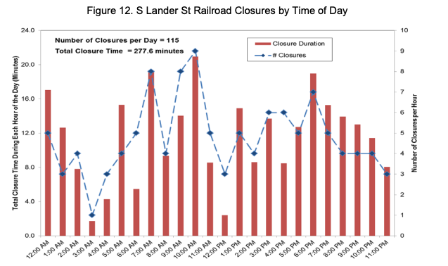Last week, SDOT’s blog post about the opening of Lander Street boasted of the environmental improvements that will come from the project: “Say goodbye to over 4.5 hours of idling vehicles each day along S Lander St!” This is true, there were 4.5 hours of total railroad gate closures, on average, per day during the study period in 2016. This includes an average of about 17 minutes at midnight, and 20 minutes at 10 a.m., etc.