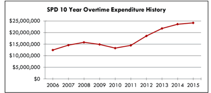 As one might expect, a department with $30 million in planned overtime isn’t exactly careful in how to spend it. That number has escalated out of control over the last 15 years. In 2006, SPD spent about $13 million on overtime, but that has more than doubled since.