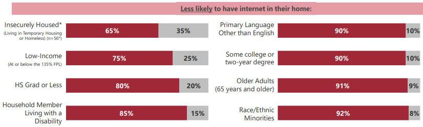 The other 5%–roughly 37,000 residents–doesn’t break down evenly among demographics, economic barriers are cited as the most prevalent in households without internet. This is clearly reflected in the housing insecure, and legally impoverished being among the least likely to have internet. Other overrepresented groups appear due to poor experience with internet quality, digital illiteracy, and lack of trust in internet providers and technology companies.