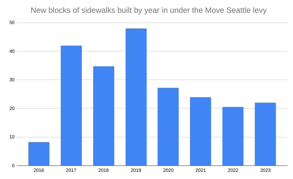 The final levy proposal that the Harrell Administration transmitted to the city council included a commitment to build 250 blocks within the first four years of the levy, still a big increase in the pace of sidewalk construction, but one that SDOT is apparently ready to handle, given the improvements that the department has been making around project delivery in recent years.