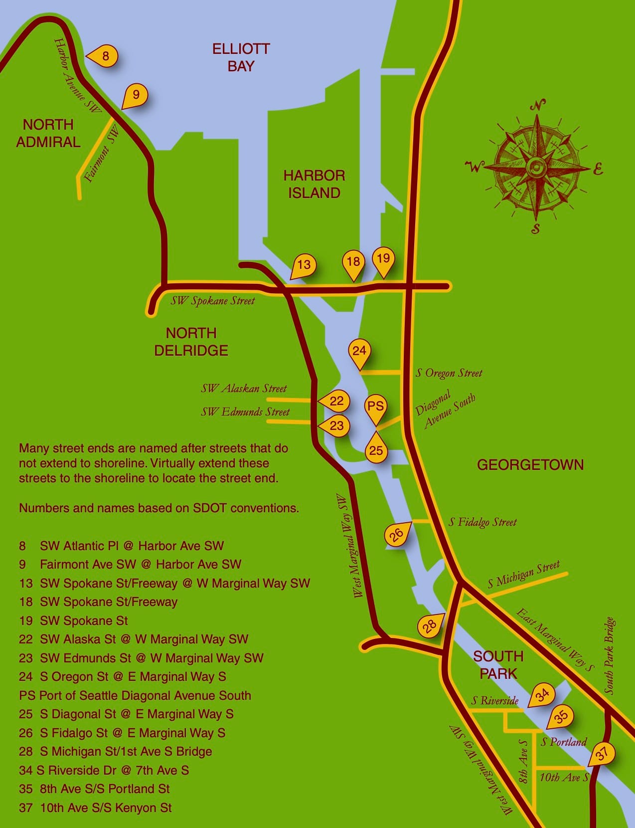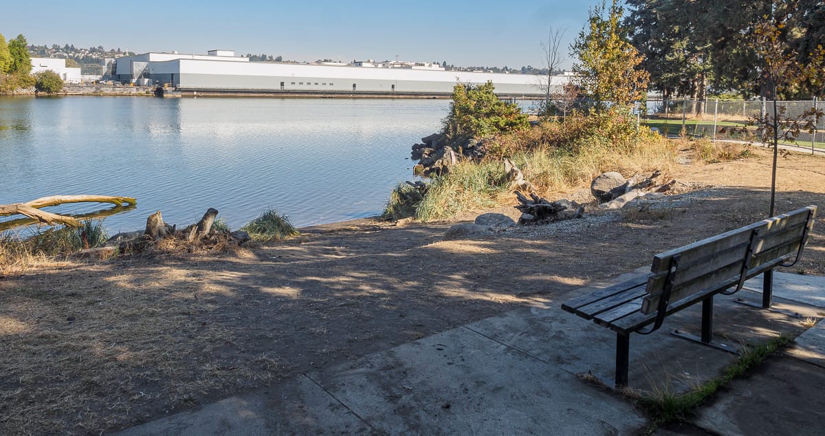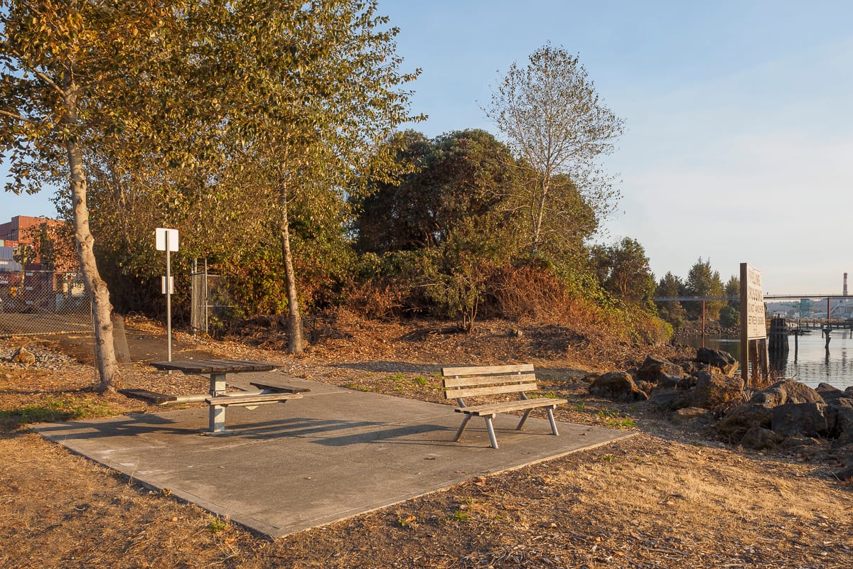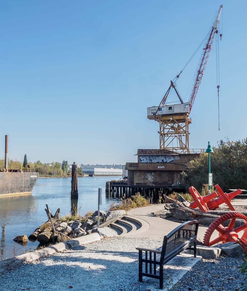 Spokane Street: Street Ends #13, #18, and #19Solitude is on hand at Southwest Spokane Street/Freeway (#13). Tucked beneath the West Seattle Bridge, the street end offers some magnificent views of our working waterfront if one looks to the north.Another pair of street ends, but of a different nature. This pair run parallel to the street and are not ends at all. Regardless, Southwest Spokane Street/Freeway (#18) and Southwest Spokane Street (#19) provide a popular fishing spot and unsurpassed views of Seattle’s main concentration of container terminals.West Marginal Way: Street Ends #22 and #23As it approaches Elliott Bay, the Duwamish River was straightened and dredged in order to accommodate the industrial uses that line its shore, and it becomes the Duwamish Waterway. Part of this legacy includes remediation of the decades-long dumping and leaching of toxic waste into the water; the dredges are an evocative reminder of past and current clean-up efforts.Southwest Alaska Street (#22) and SW Edmunds Street (#23) are both nestled within a lush riparian corridor. The northernly of the pair, #22, leads to a network of pathways that trace the waters edge. Southwest Edmunds Street gives access to the he?apus [this is the correct spelling] Village Park & Shoreline Habitat, a Port of Seattle park, highlighting an important cultural site along the shore of one of the last remaining bends of the Duwamish River before it was channelized.East Marginal Way: Street Ends #24 and #26, Street End #25 and Diagonal AvenuePublic access to the Duwamish is limited, and often has to squeeze itself between the dominant maritime and manufacturing uses. Although modest – a concrete slab and bench as well as controlling for invasive plants that limit access and views – South Oregon Street (#24) provides a significant break in the wall of its less accessible neighbors.Unlike many of its fellows, South Fidalgo Street (#26) offers distant views both of the aquatic and terrestrial environments where landward views are frequently blocked by fences and thick plantings that discourage the curious visitor’s attentions.When funding is available, street end shorelines like Diagonal Avenue South (#25) provide opportunities for intensive efforts in riparian restoration, including shoreline stabilization. The street end preserves access to the Diagonal Avenue South Public Shoreline Access. While not part of the SDOT program and not a street end, it is none-the-less a splendid park that is impeccably manicured and welcoming.South Park: Street Ends #28, #34, #35, and #37Furnishings, recreational access, shoreline and landscape improvements – all are priorities of Friends of Street Ends and all can be found at South Michigan Street/1st Avenue Bridge (#28). While not bucolic as the shorelines along Lake Washington or Puget Sound, the amenities provided at #28 more than address the challenges of its being situated below a busy bridge.Seattle Street End #34, Riverside Drive, provides a small viewing area tucked among restored native plantings. Nearby, one of the more developed Duwamish shorelines is found at 8th Avenue S/S Portland Street (#35). This street end includes water access, terraced and bench seating, and art. It is also linked to Street End #34 via a gravel path. Which brings us to Seattle’s farthest south street end, #37 at 10th Avenue South/South Kenyon Street. It has open, unobstructed views, perfect for watching ships pass.