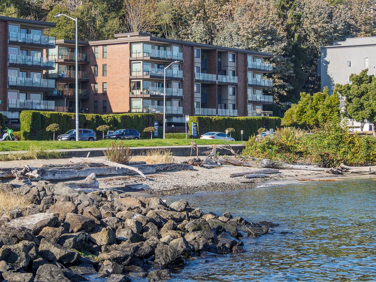 Blended into West Seattle’s expansive public shoreline, Southwest Atlantic Place (#8) and Fairmont Avenue (#9) are barely discernible, yet the keen street end observer will take note of a modest bench at Atlantic Place and a robust seawall and rocky beach at Fairmont Avenue.