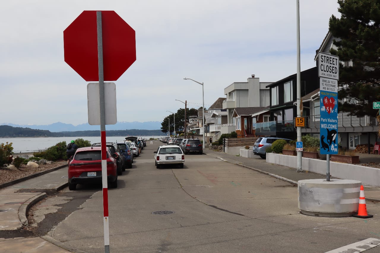 Alki Point for All created an “alternative vision” for the street that, naturally, involved retaining all of the parking and instead applying art to the street as a traffic calming measure. The group also called for removal of the “Street Closed” signs which had actually been installed to comply with state law that doesn’t allow pedestrians to walk along an active roadway while the street is open, but the City took the suggestion to add welcome signs to the street’s entrance and ran with it. New signs with seals and whales now declare “park visitors welcome.”