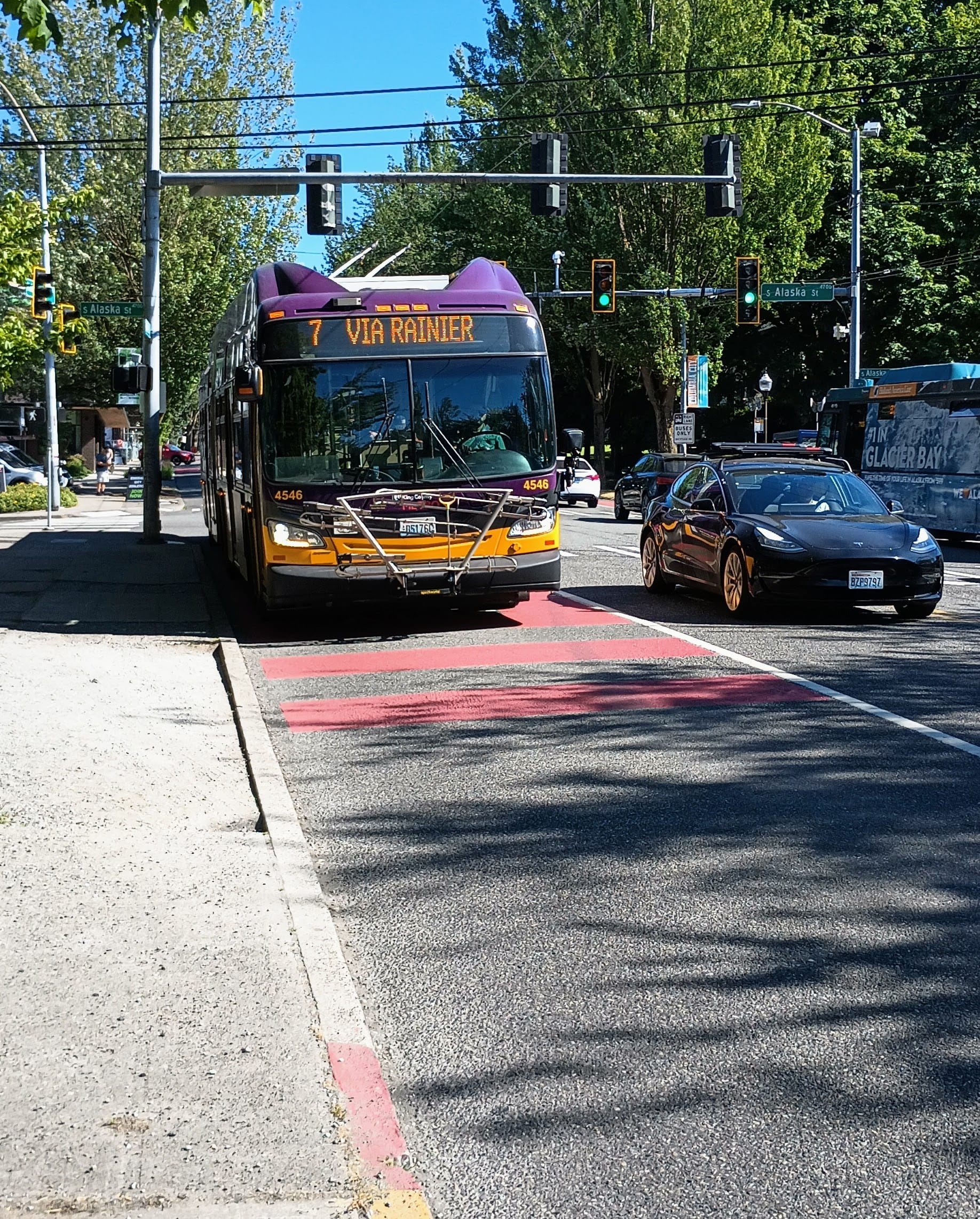 The element of the plan focused on public transit proposes a framework around the addition of transit-only lanes, which until now have been largely moved forward on a one-off basis. A set of tiers based on the number of buses using a street would mean 24/7 bus lanes would only be “expected” on streets with 400 scheduled bus trips per day, with streets seeing between 200-400 buses would only be expected to see peak-only bus lanes. “Transit should be a competitive mode of travel, while still maintaining mobility for other modes,” the plan says of those “medium priority” streets, which include Rainier Avenue south of McClellan Street, where the city’s second highest ridership bus, the Route 7, runs.