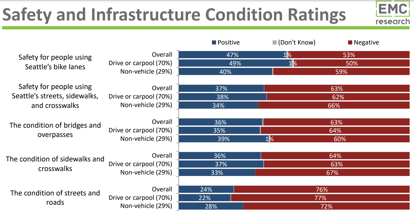 SDOT’s poll found voters viewed the conditions of roads negatively as well by a 76% to 24% margin, and 81% rated it important to “repave more than 200 miles of major streets that are rated in poor condition.” In another prompt, 76% rated it important to fix potholes “within 72 hours of when they are reported.” Maintaining bridges to avoid larger emergency repairs down the road was highly popular in a city recently scarred by the sudden closure of the West Seattle Bridge.