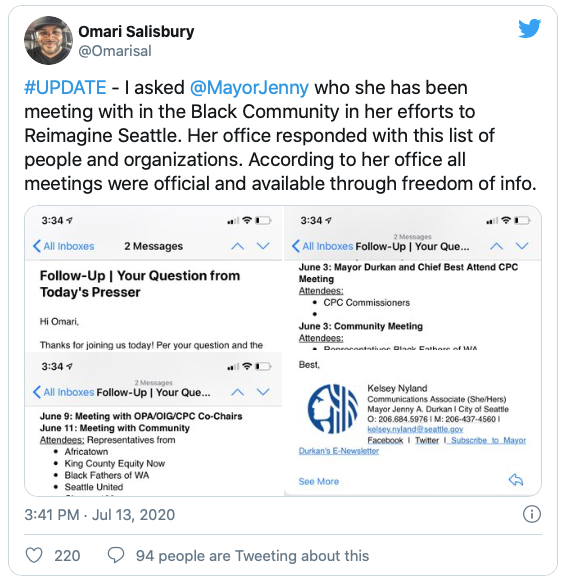 When questioned by journalist Omari Salisbury of Converge Media about how much she had engaged with community members before creating the proposed budget, Durkan stated that had been meeting with Black-led organizations throughout the process of making the budget. The Mayor attempted to support that statement with a list provided to Salisbury, which he shared on Twitter.