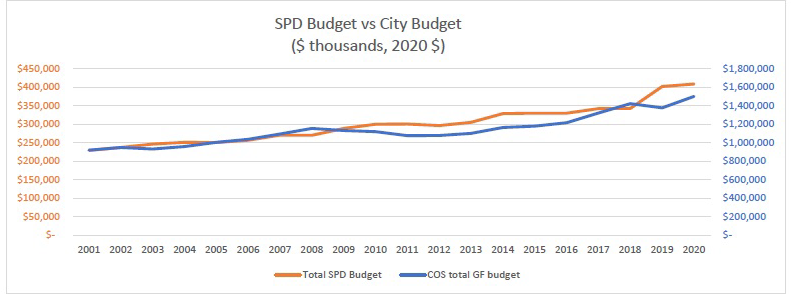 And while councilmembers might be unhappy with a 20% cut for 2021, they may also find that defunding SPD at 50% might be more difficult than anticipated. SCC Insight analyzed about 20 years of the SPD budget and found that the SPD budget has generally kept pace with the City budget as a whole, meaning that unless services are eliminated those costs will be moved from SPD to new programs and departments.