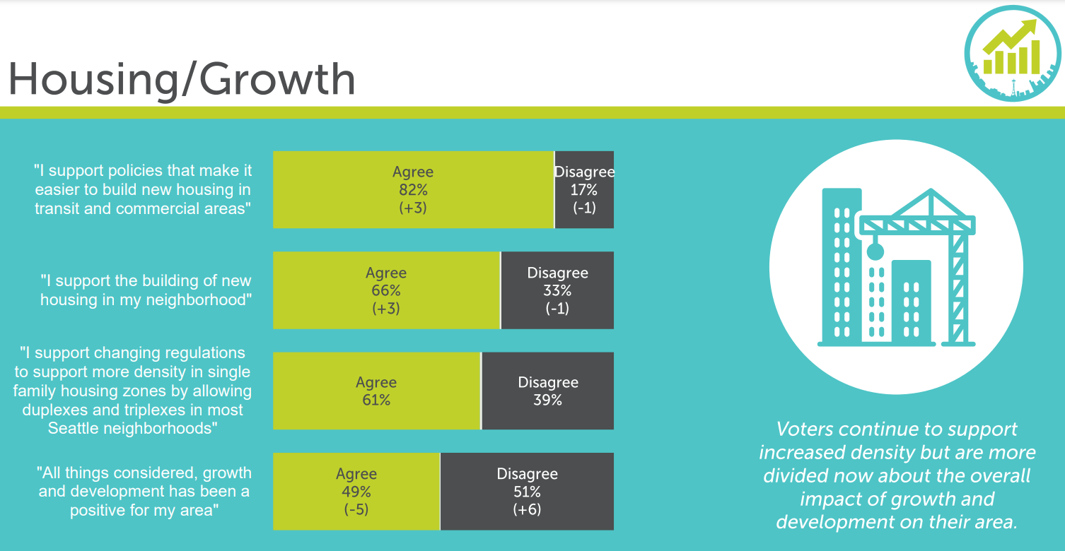 Voters overwhelming favor adding more housing near transit by a 82% to 17% margin, which is up 3% since the Chamber’s last poll. And in Seattle that’s the majority of the city. Moreover, Seattleites are supporting changes to single family zones in increasing numbers, favoring triplex zoning in most areas by a 61% to 39% margin. The only subgroup to oppose this change is people who identify as Republicans.