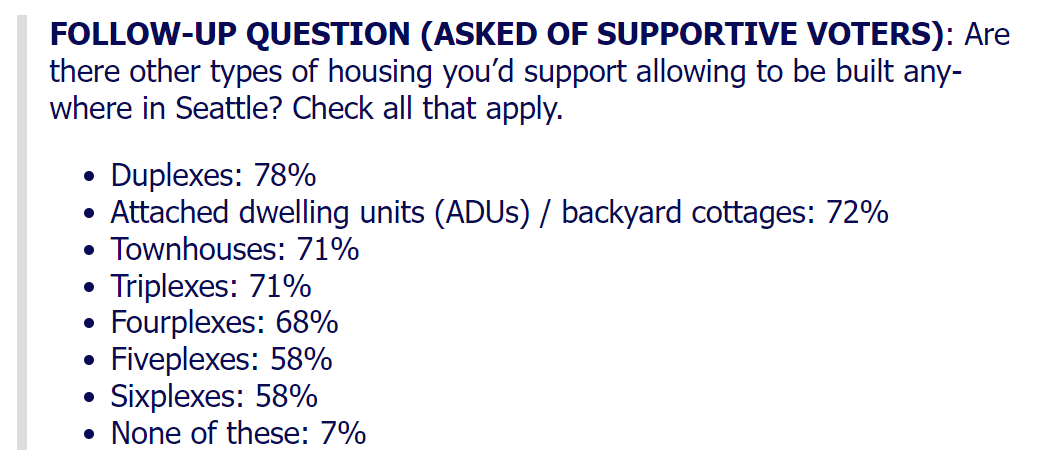 The poll provides strong support for an all-of-the-above approach to adding housing all across Seattle, with the interesting twist that social housing developments appear to make larger buildings more popular than they’d otherwise be. More than two-thirds of Seattleites support market-rate fourplexes anywhere, but a similar share support four- to six-story apartment building geared toward the working class.