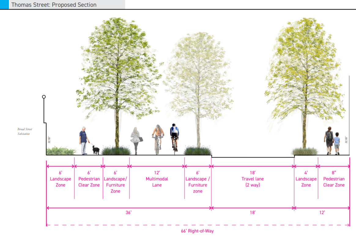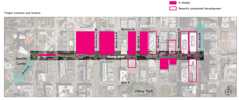 The design also includes a traffic diverter that prevents through car traffic on Thomas Street, making permanent an earlier temporary treatment, while offering pedestrians a large median refuge as they cross Dexter.