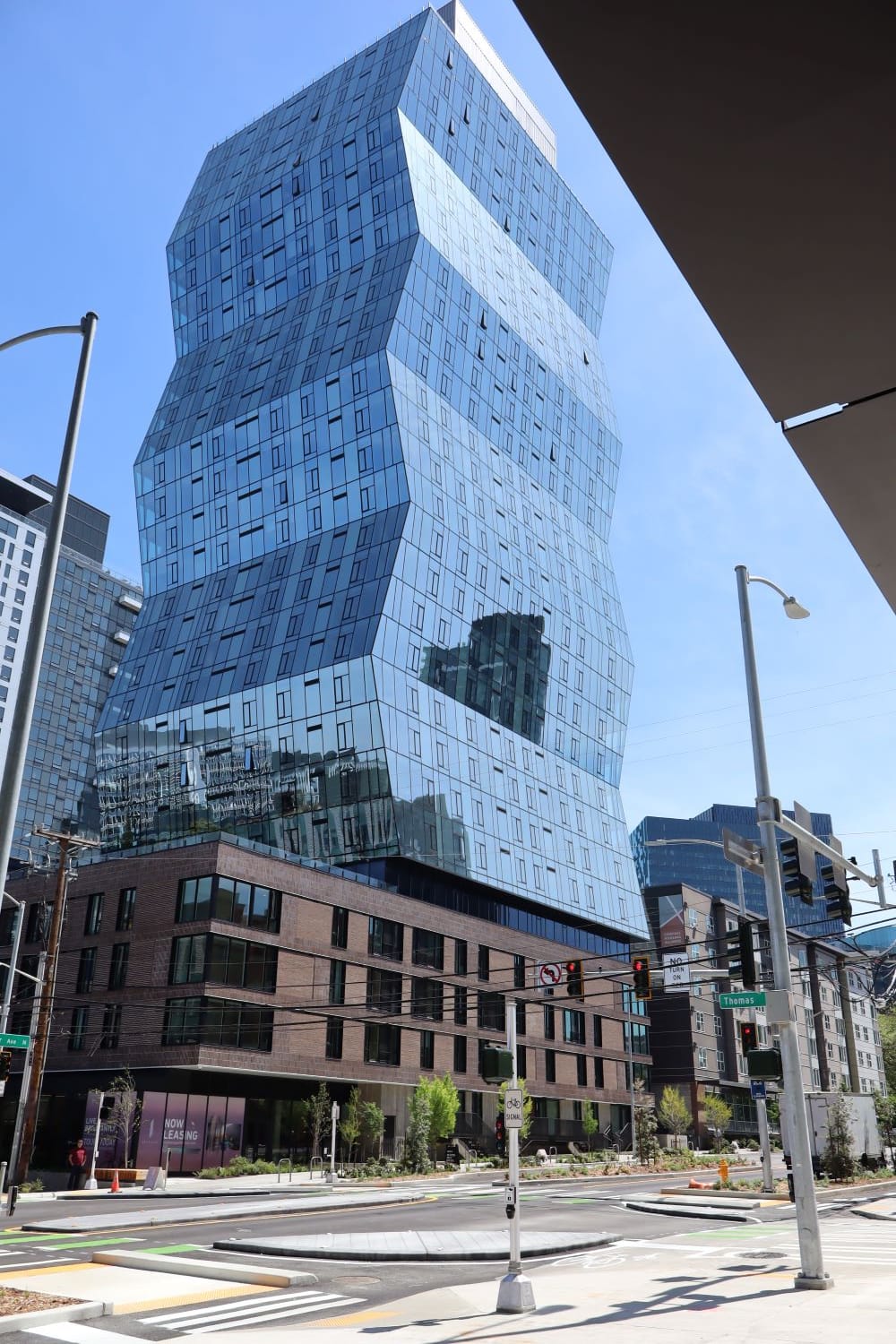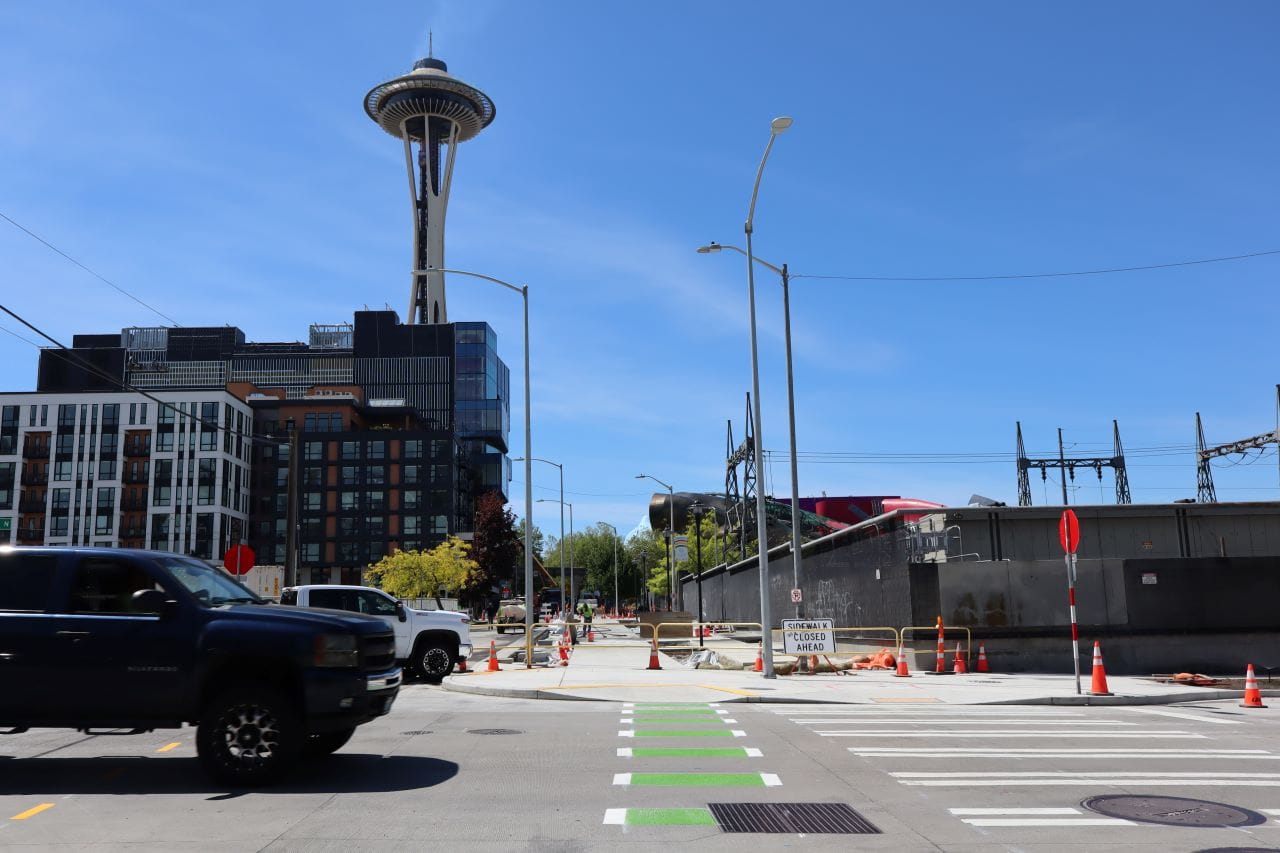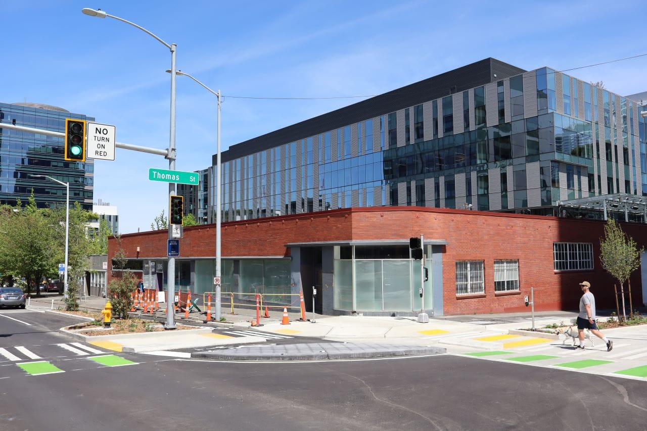 The protected intersection has long been planned as part of a “green street” on a “redefined” Thomas called out in plans to reconnect the street grid after the SR 99 tunnel went into place and to upgrade transportation to a renovated Seattle Center Arena (now called Climate Pledge Arena). But the protected intersection had been repeatedly delayed due to budget cuts.