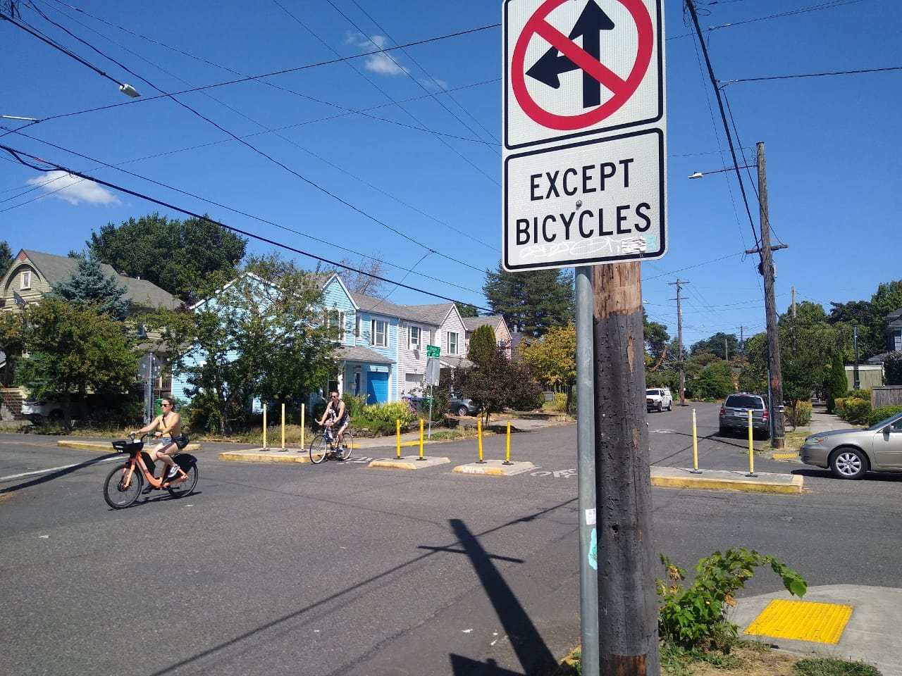 Many new diverters are installed directly at spot a neighborhood greenway intersects with an arterial street, allowing people walking and biking to continue across but requiring drivers to make a right turn — a contrast with legacy diverters that were installed in the middle of neighborhoods.