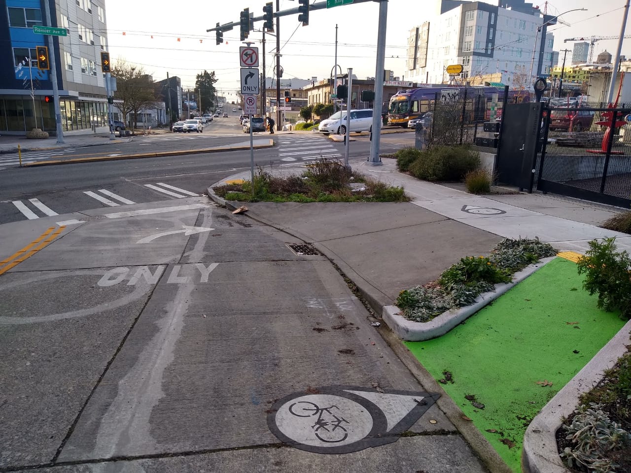 The Rainier Valley Greenway, which was installed in 2016 when Seattle’s south end had essentially no other protected bike lanes, exemplifies in many people’s minds the idea that greenways are a substitute for on-street bike facilities through areas where the city lacks political will to take away parking of vehicle travel lanes. Rainier Avenue is the most direct route for anyone on bike trying to cut across the neighborhood, but it lacks any dedicated space for bikes.