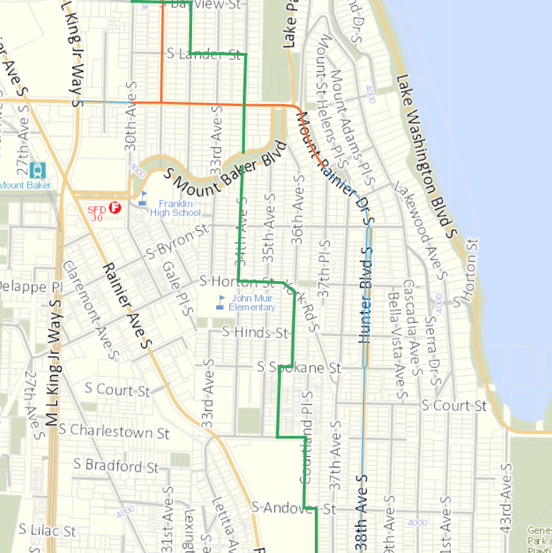 Matthew Snyder lives in the Hillman City neighborhood of the Rainier Valley and uses the north-south greenway in that neighborhood to get around both on foot and by bike. The Rainier Valley Greenway is one of the longest neighborhood greenways in the city, and also one of the most circuitous, zig-zagging through Mount Baker, Columbia City, Othello, and Rainier Beach, and making more than 30 turns along the way. If you aren’t watching for signs or pavement markings, it’s easy to find yourself inadvertently biking off the greenway.