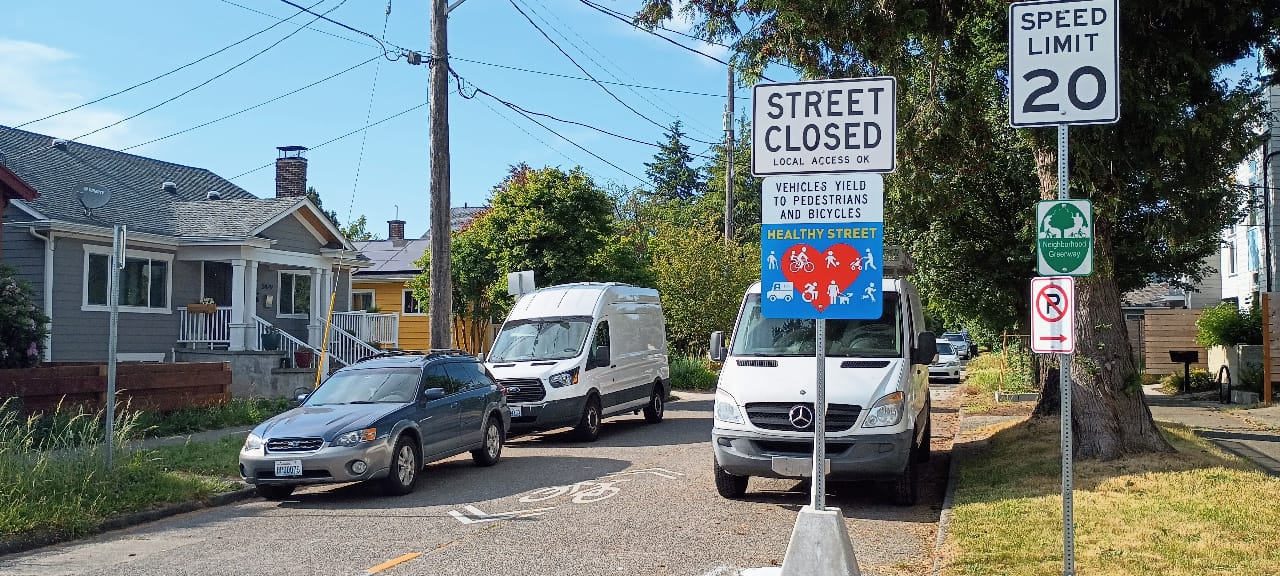 The “Healthy Streets” program, Seattle’s response to the increased demand for street space for pedestrians during the early months of the Covid-19 pandemic, tries to create an upgraded neighborhood greenway, adding “street closed” signage that allows people to walk and roll in the street when state law would otherwise ban it. But they remain self-enforcing, with little to no repercussions for drivers who choose to ignore signage. And it only takes one driver bearing down on someone trying to enjoy their local Healthy Street to sour someone on using the facility again.