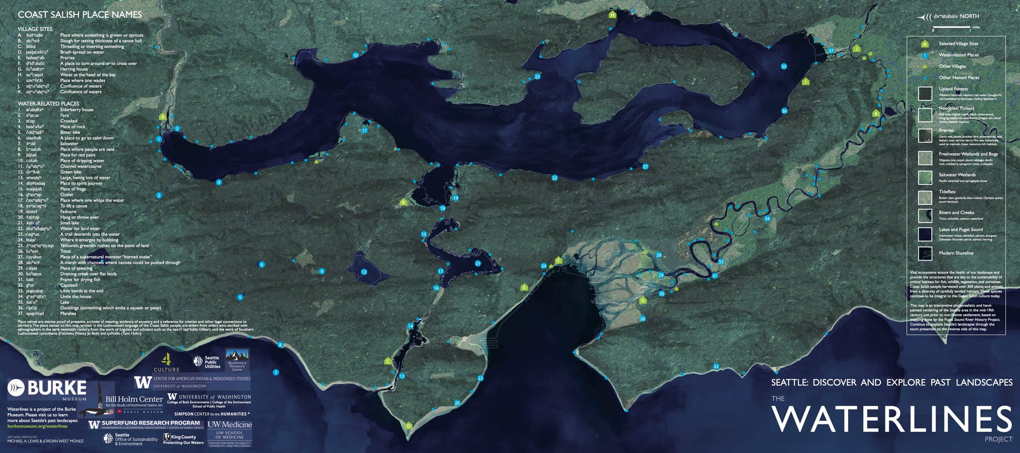 Some maps are infuriating because they illustrate the city’s history of brutal oppression. Like this beautiful work by the Burke Museum’s Waterlines Project illustrates the city’s lost waterways and Coast Salish settlements before colonization by European descendants. It is a well done map with explanatory narrative and website to assist. It’s also striking because the eastward perspective makes us reconsider many things expected from a map. The orientation from the Sound looking inland to the east emphasizes waterways instead of the highways we’re used to. It’s a perspective indicative of a mindset associated with water rather than long ribbons of asphalt and a bit foreboding given we are looking towards where the colonizers are coming from.