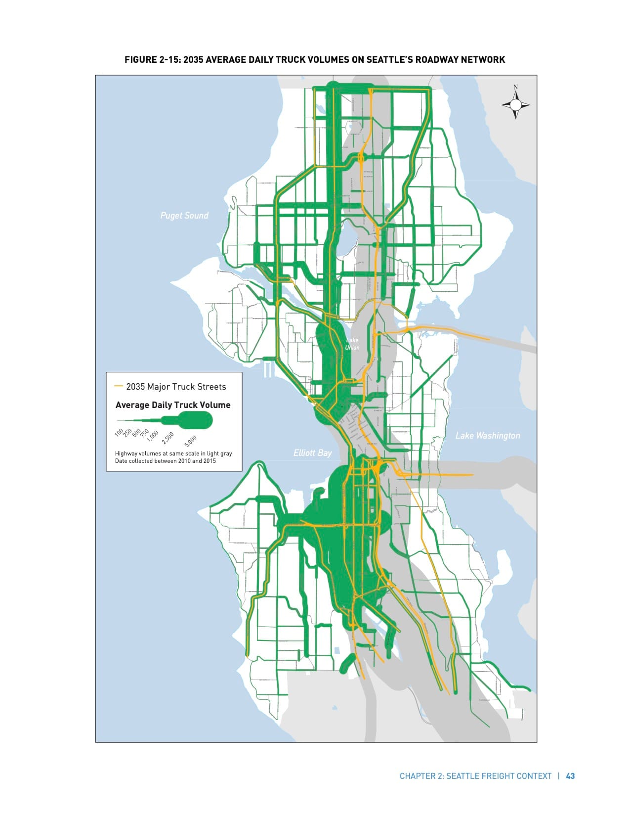 The map traces the important freight routes throughout Seattle. For every increase in truck traffic on a segment of road, the line gets thicker. All of downtown and SoDo are inseparable blobs. Traffic spills off the roads and into Lake Union and Green Lake. No neighborhood is spared from the many amorphous tentacles of the Beast With a Thousand Engine Breaks.