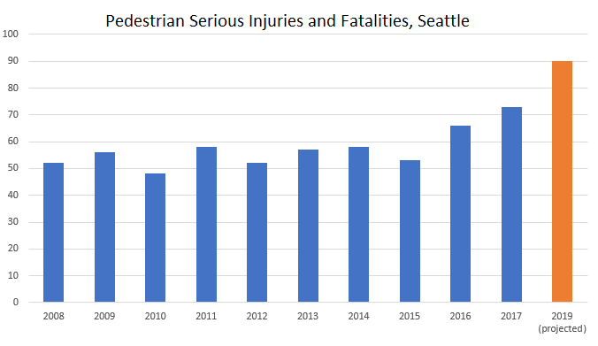 In the first six months of 2019, someone was seriously injured or killed on Seattle’s streets at an average rate of once every 44 hours, the highest number in almost a decade. This week Michelle Baruchman at The Seattle Times was the first to obtain the data showing that between January 1 and June 30 Seattle saw 98 traffic collisions that resulted in serious injury or loss of life of 101 people. Even more alarming still is the rate at which pedestrians getting seriously hurt continues to climb.