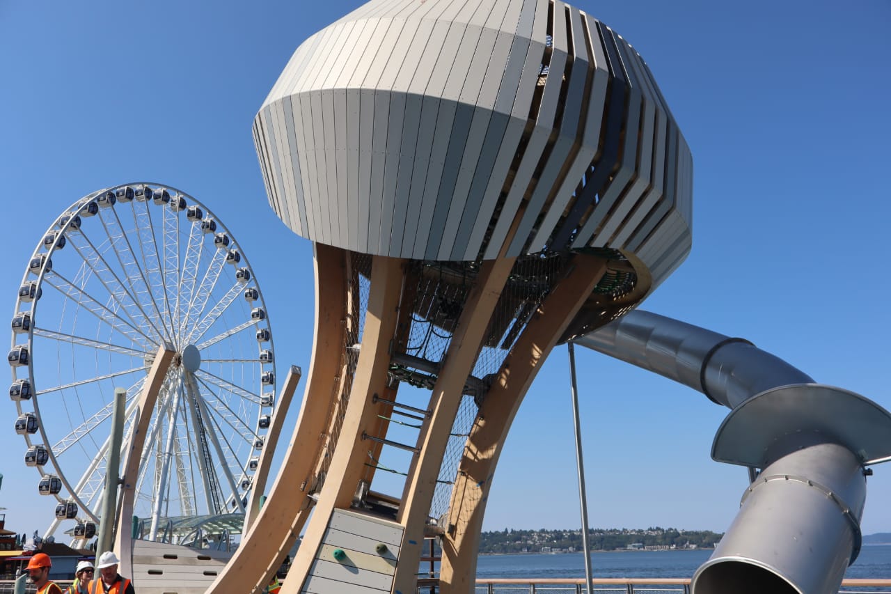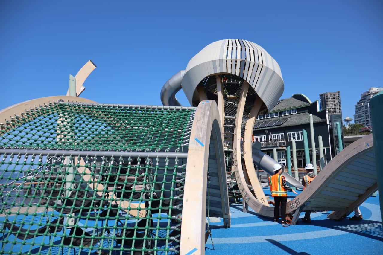 Kids from around the Seattle region have been watching the new playground take shape at Pier 58 from behind the construction fences for months, stoking anticipation for the grand opening this week. The centerpiece of the playground is a 25-foot-tall climbing structure intended to mimic a jellyfish, which kids can climb up into, with an attached metal slide.