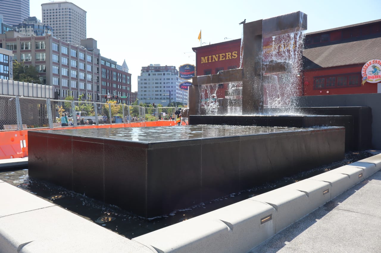 The new park space features a direct nod to the 1974 Waterfront Park, in the form of Waterfront Fountain, a sculpture created by James FitzGerald and Margaret Tomkins. Housed in a brand new water feature, the fountain was restored after falling into Elliott Bay when the former Pier 58 collapsed in 2020 as it was in the process of being demolished. The fountain joins additional water features along the waterfront including George Tsutakawa’s Joshua Green Fountain further south at Colman Dock.
