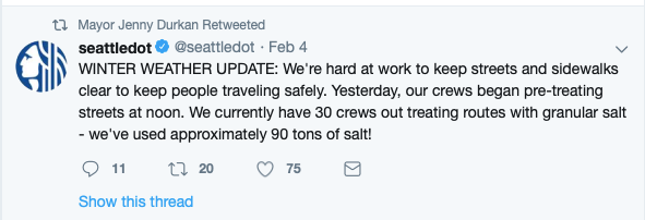 What is surprising is how excited SDOT is about dumping all this salt. SDOT really wants Seattleites to know they use, to quote a 2016 SDOT blog post,“a lot (lot) of salt.” Given the retweets by the Mayor and City Council, it appears they also want Seattleites to be in the know about all this salt as well.