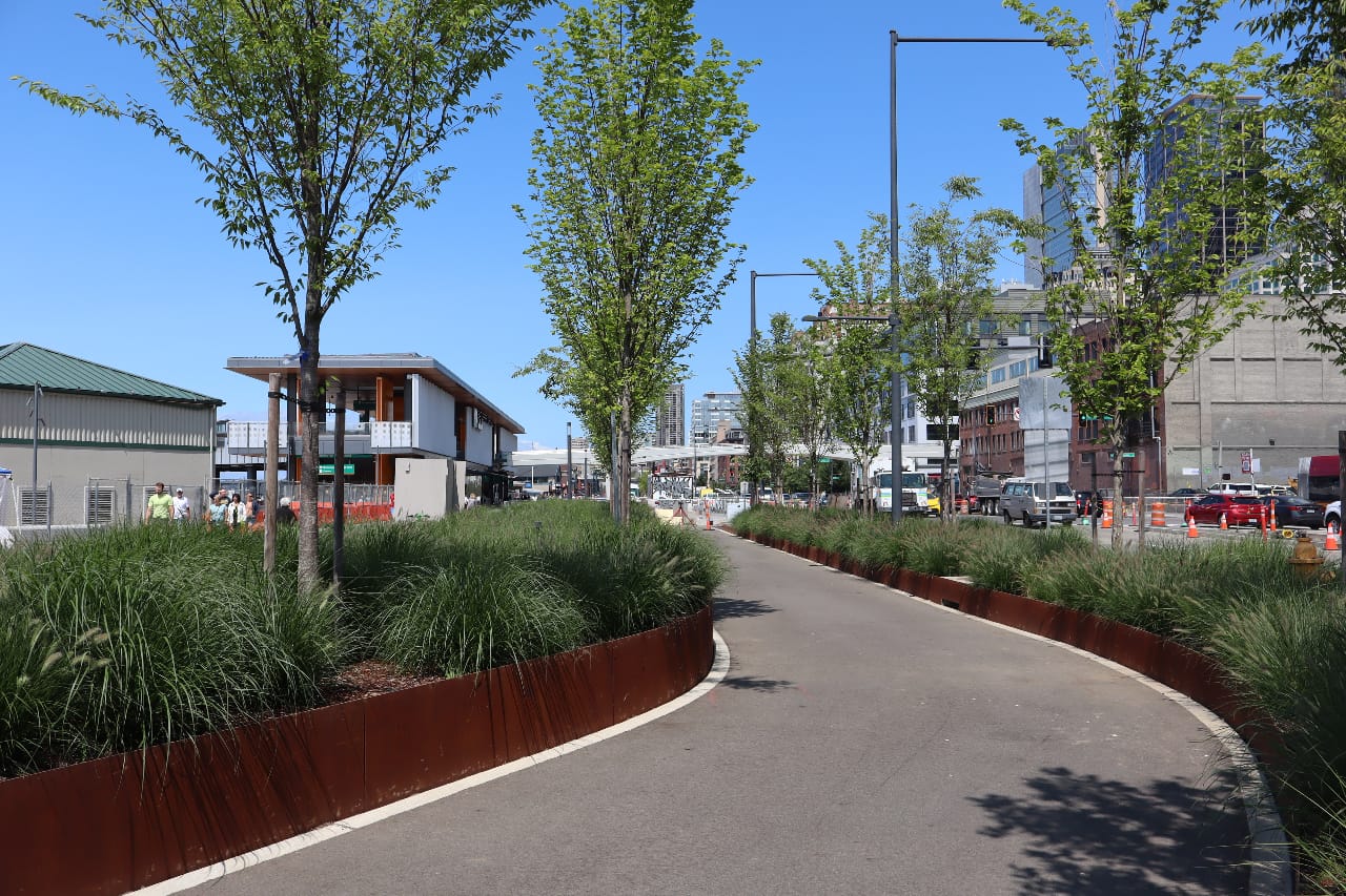 The central waterfront bike path, which is already open south of Yesler Way, is one of the most highly anticipated elements of the $806 million waterfront revamp, funded through a combination of state funding, city funding, and taxes collected as part of the waterfront’s Local Improvement District (LID). Once it finally opens, people on bikes will have a fully separated route from Belltown to the Portside Trail that extends to the West Seattle Bridge. A separate bike lane connecting from just north of the aquarium to the Elliott Bay Trail in Myrtle Edwards Park, built by the Seattle Department of Transportation (SDOT) is set to start construction later this year and complete the waterfront bike network.