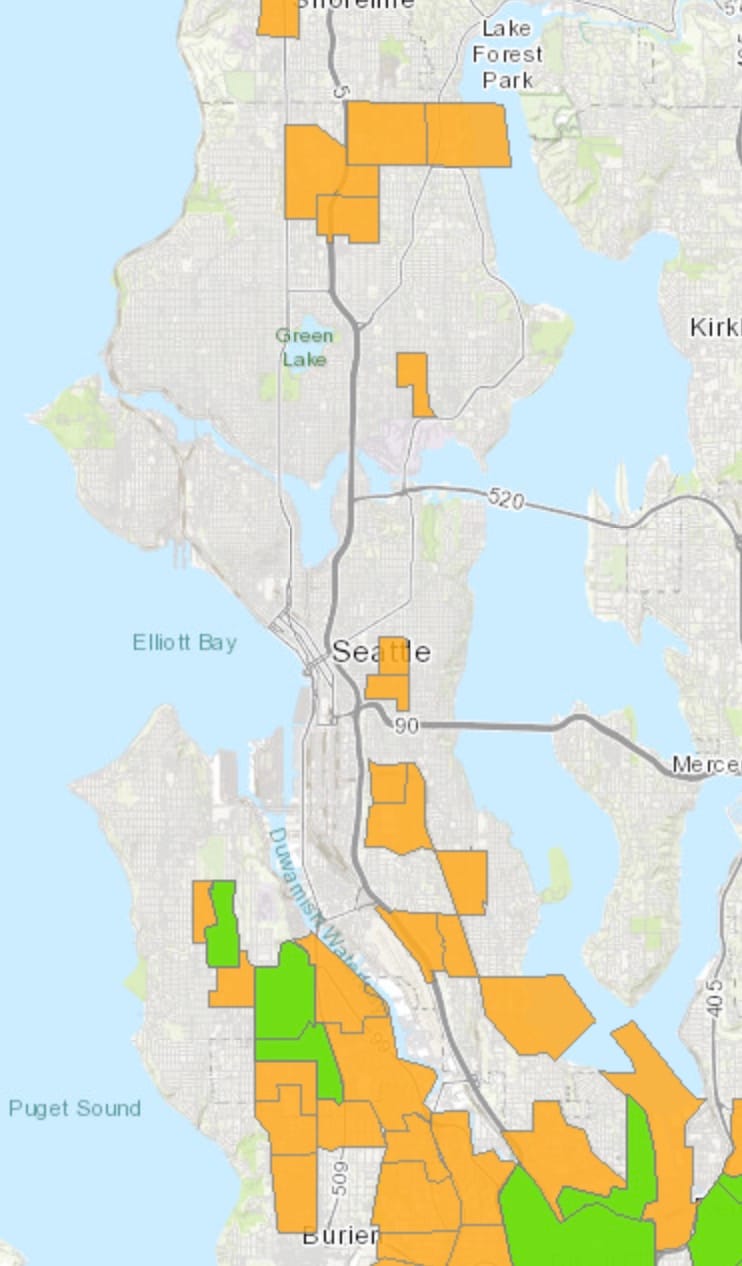 The answer is poor communities of color. Due to impoverished communities bordering I-5 and various airports, there is a solid band of “HIGH (10)” environmental risk neighborhoods stretching from SeaTac to the stadiums. No census tract north of Downtown hits that risk. Only two North Seattle tracts are level 9 while there are a dozen in the south.