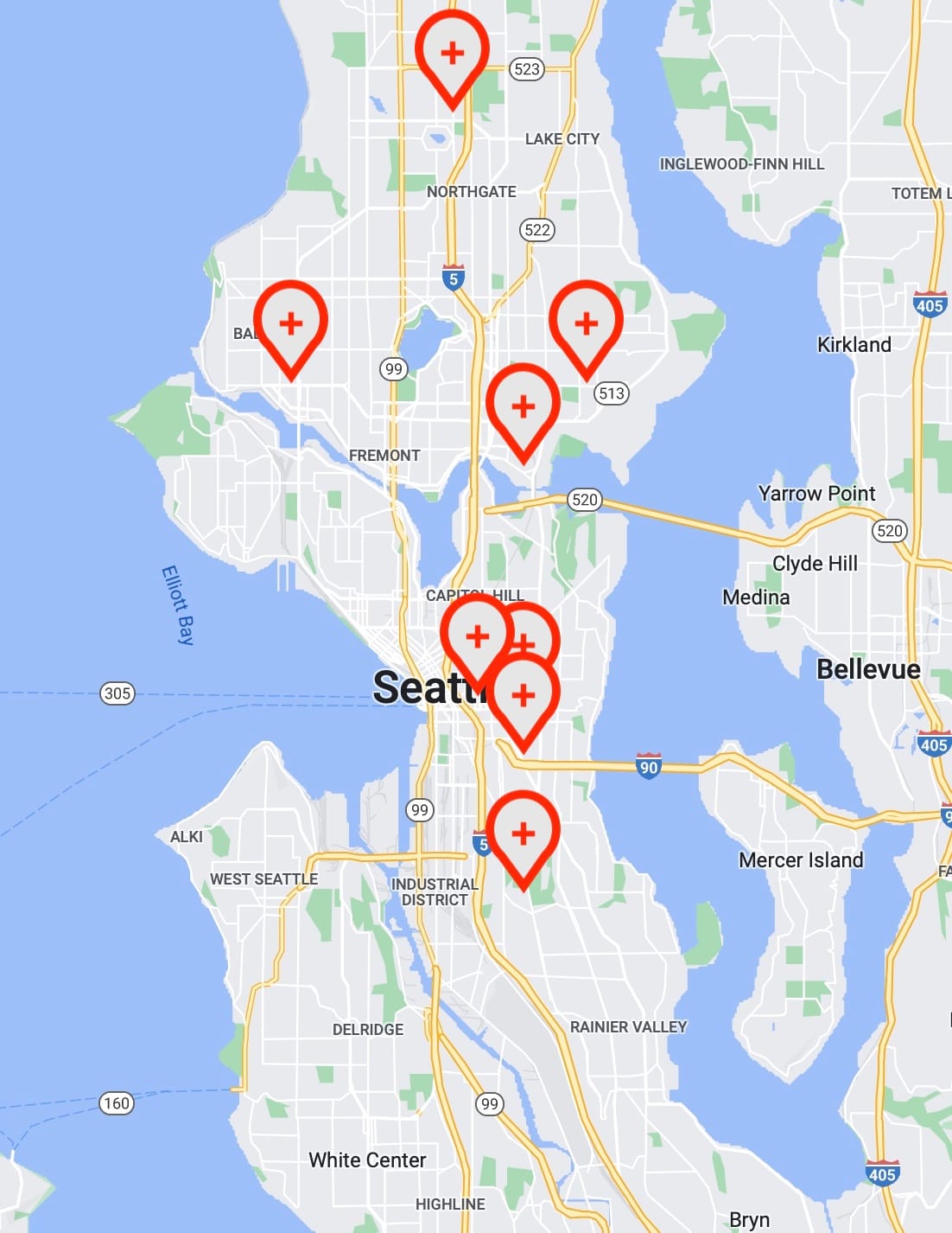 Seattle has one hospital south of I-90, and that’s the Veteran’s Administration Hospital off Beacon Avenue. The city’s main cluster of hospitals include Swedish, Virginia Mason, and Harborview, and are all tucked together in the southwest corner of First Hill. North of the Ship Canal are UW Hospital’s main campus and Northwest Center, Swedish Ballard, and Seattle Children’s hospital.
