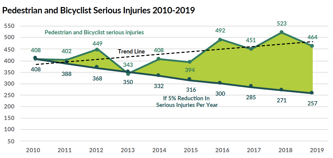 When viewed as a whole, statistics show that the number of serious injuries and deaths among pedestrians and cyclists across Washington State has generally outpaced population growth over the last 10 years. While Washington’s population increased by 11.86% during this period, fatalities for pedestrians, which includes people using wheelchairs and other small rideable devices, rose by a whopping 62.5%, while the overall trend in cyclist fatalities increased by 61.4%.