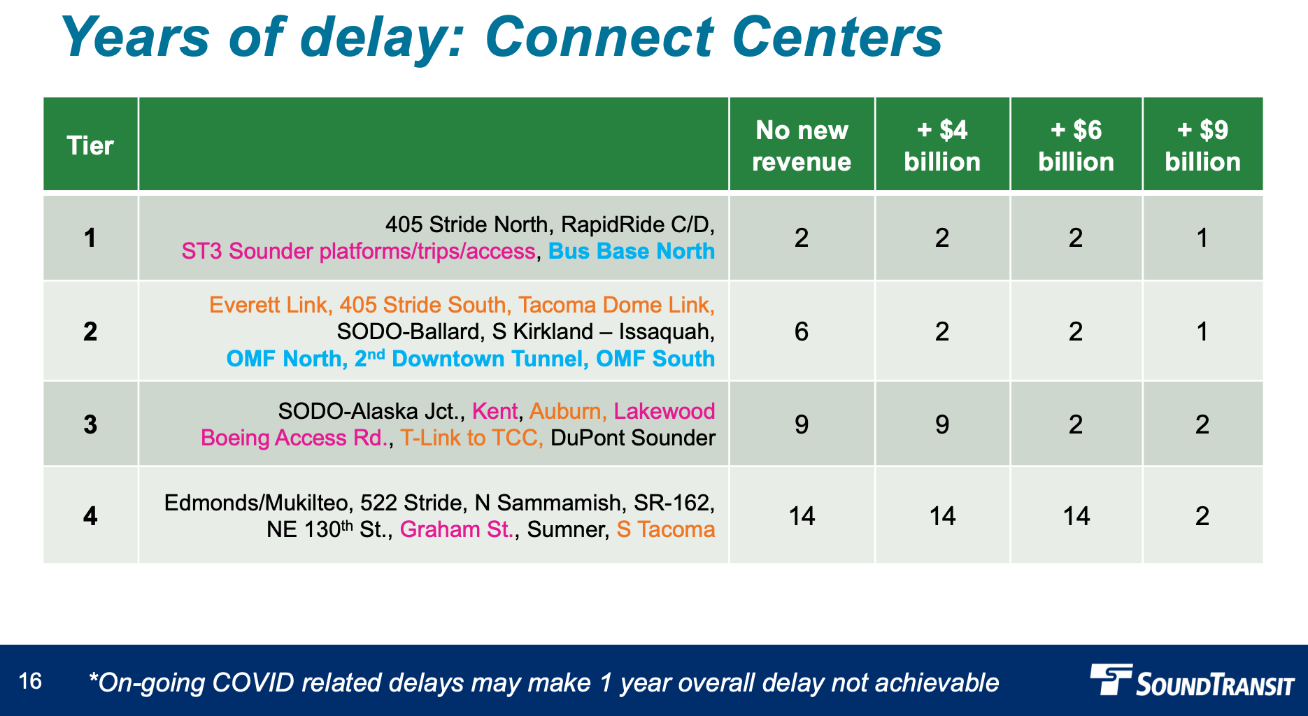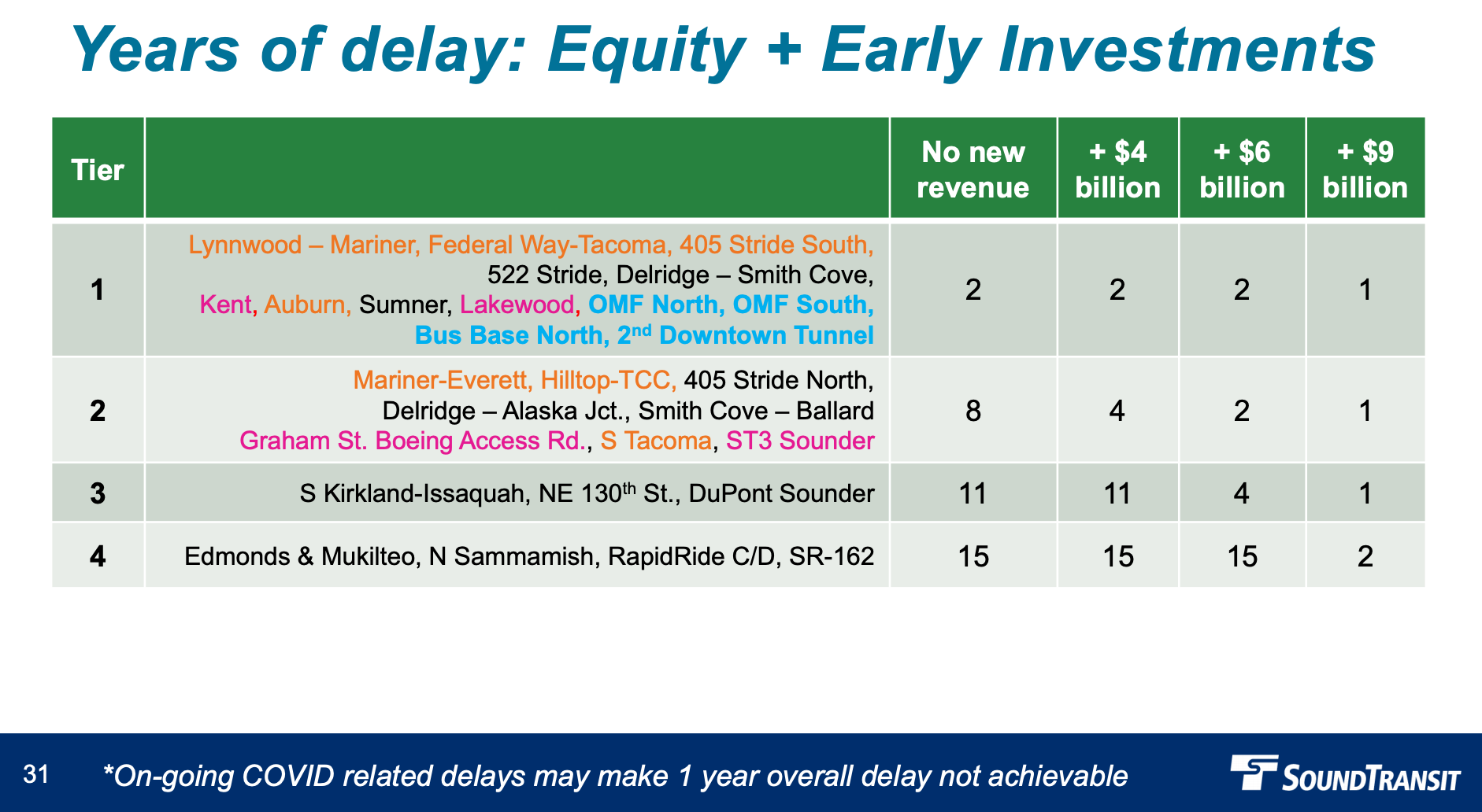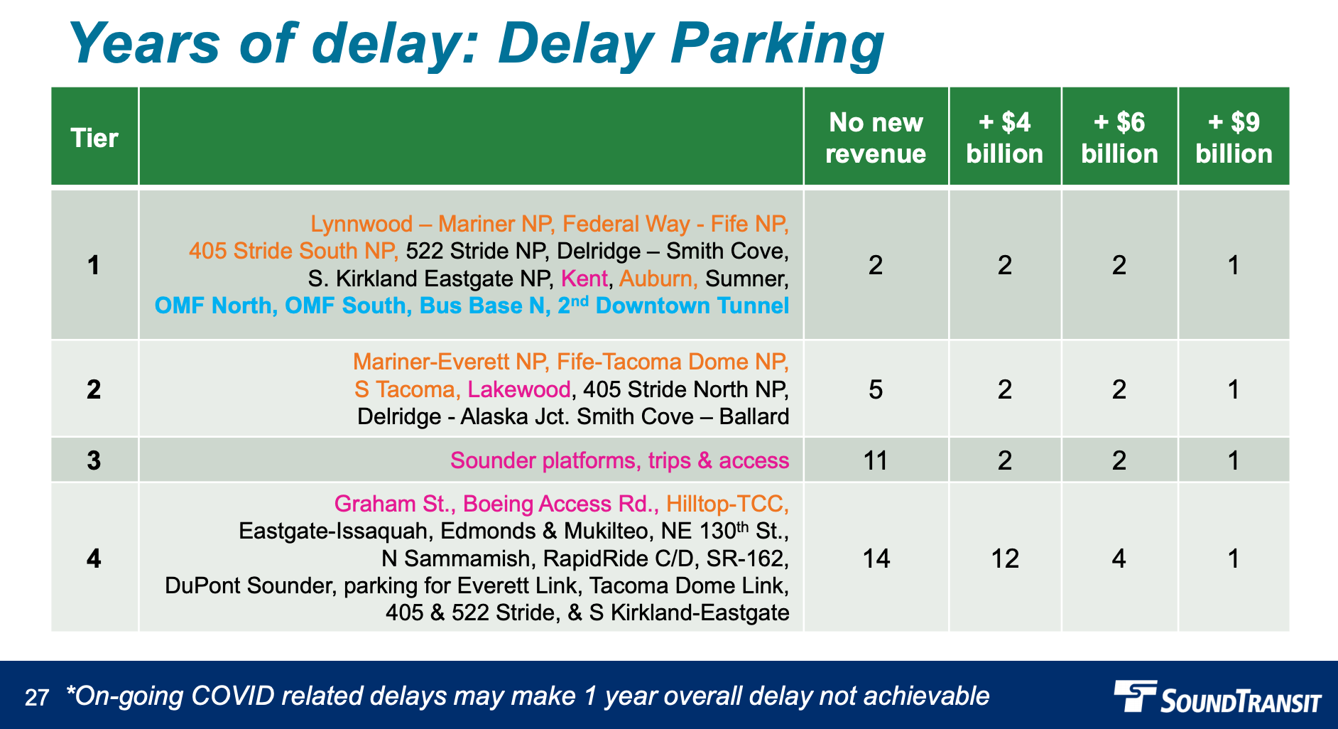 By delaying parking, Sound Transit would be able to keep most of the light rail projects closer to their original timelines without any additional financial capacity. Big ones like Lynnwood-Mariner, Federal Way-Fife, and Delridge-Smith Cove would only experience two years of delay. With five years of delay, Smith-Cove, Delridge-Alaska Junction, Mariner-Everett, and Fife-Tacoma Dome could be delivered. However, Eastgate-Issaquah and Hilltop-Tacoma Community College light rail projects would face painful 14-year delays under Sound Transit’s projections.With modest additional financial capacity ($4 billion), nearly all light rail projects would face just two years of delay. This also has the benefit of salvaging timelines for Sounder regional rail enhancements and Stride bus rapid transit projects to the same period of delay. Stepping up the latter with $6 billion in additional financial capacity means that projects in the lowest tier — including parking — could mean only four years of delay, but presumably further delaying parking could shorten the wait for infill light rail stations, bus projects, and Sounder extension to DuPont. It also bears mentioning that $9 billion or more in additional financial capacity essentially limits all project delays to just over a year.