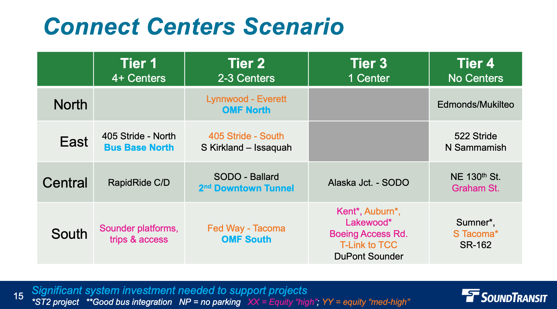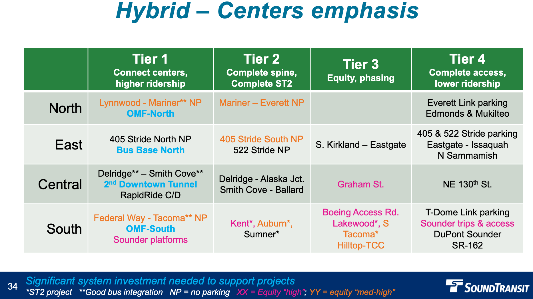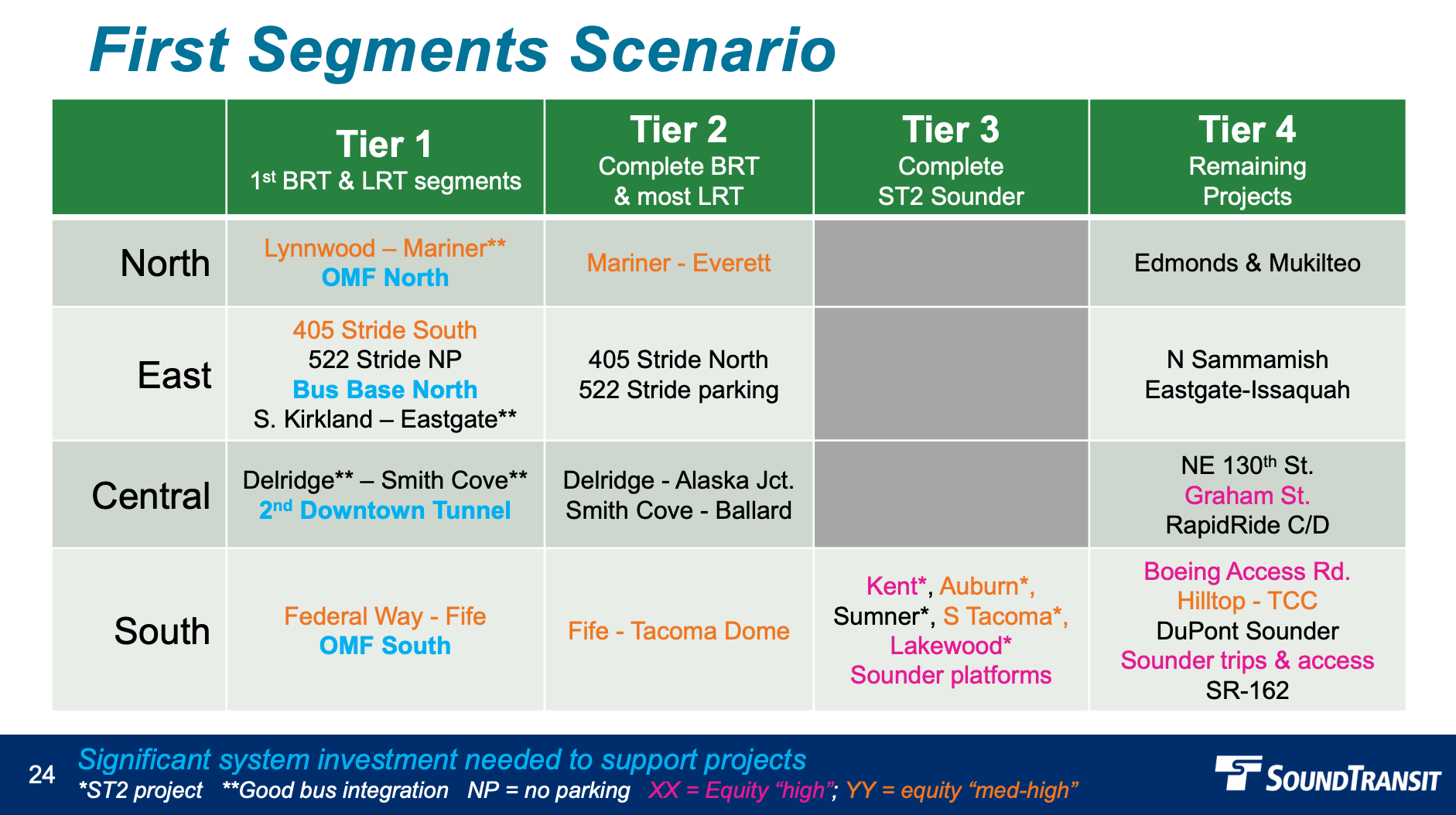 - The “connecting centers” scenario would largely keep key light rail projects within a two-year delay timeframe, though the lower performing West Seattle and Issaquah-Kirkland extensions would experience serious delays.The “equity and phasing” scenario would similarly keep most light rail, Sounder, and Stride projects to small delays, but Denny-Ballard, South Kirkland-Eastgate, and Eastgate-Issaquah light rail extensions would face heavy delays.The “equity and significant early investments” scenario presents quicker project delivery for a wider variety of project types but sends many light rail projects to slightly longer delays. It does, however, leave lower performing projects at the back end, which many be a more favorable tradeoff in the eyes of many.The “first segments” scenario is a little more scattershot, but largely keeps key light rail projects within a two- to three-year delay.The “hybrid centers” scenario pairs parking delay with the connecting centers scenario to deliver most transit projects with only a two-year delay. The main exceptions to this are the Eastgate-Issaquah light rail extension, NE 130th St infill station, and DuPont Sounder extension. Parking and other lower tiered projects would therefore be delayed by a decade to support earlier delivery of the other projects.