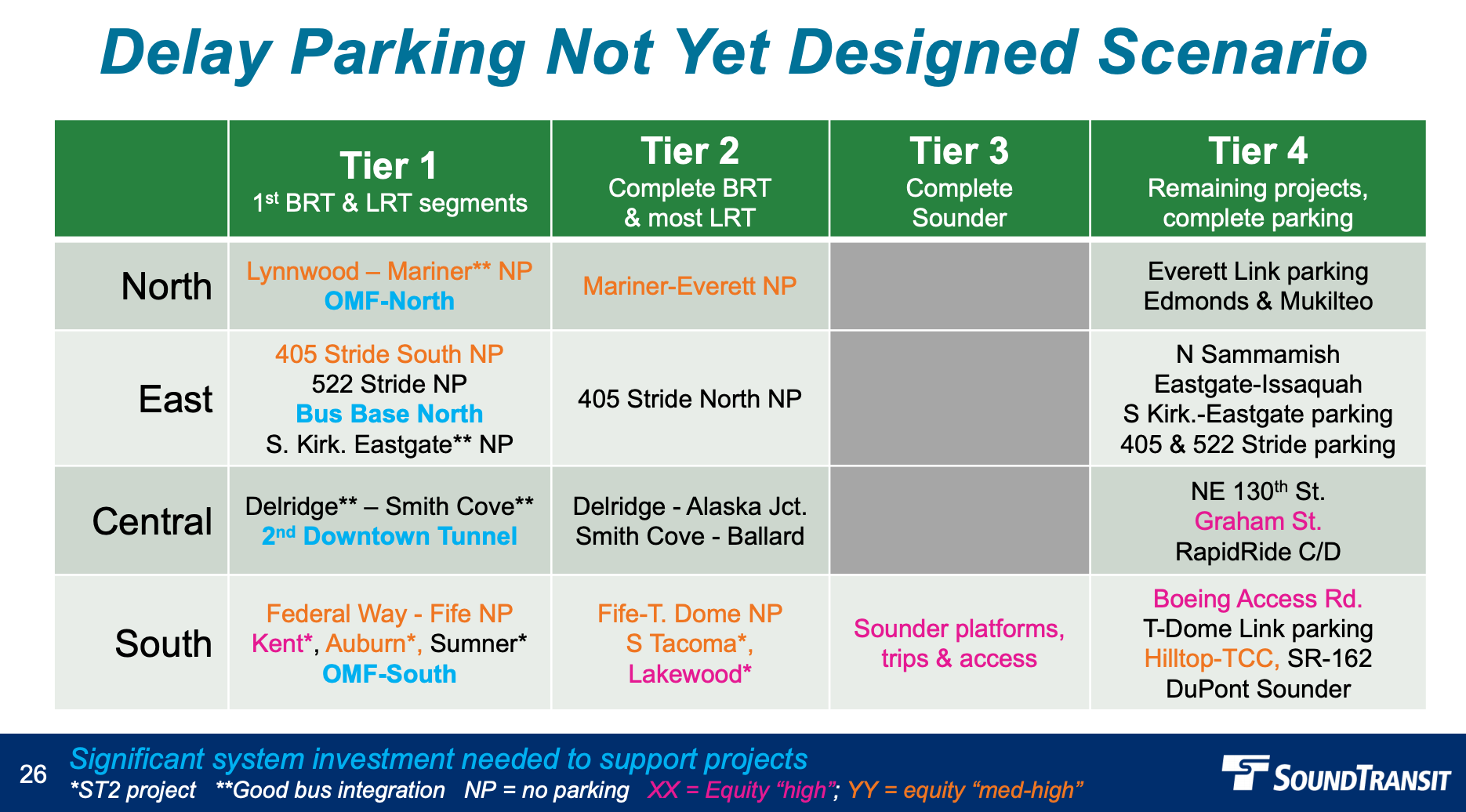 The “delay parking” scenario uses a strategy of smaller incremental light rail projects and separating parking elements of projects into standalone projects. This means that smaller light rail extension segments would be delivered as individual projects — allowing for phasing like Delridge-Alaska Junction, Delgride-Smith Cove, and Smith Cove-Ballard (three projects) versus full West Seattle and Ballard extensions (two projects) — and parking projects could be placed at the back of the line.
