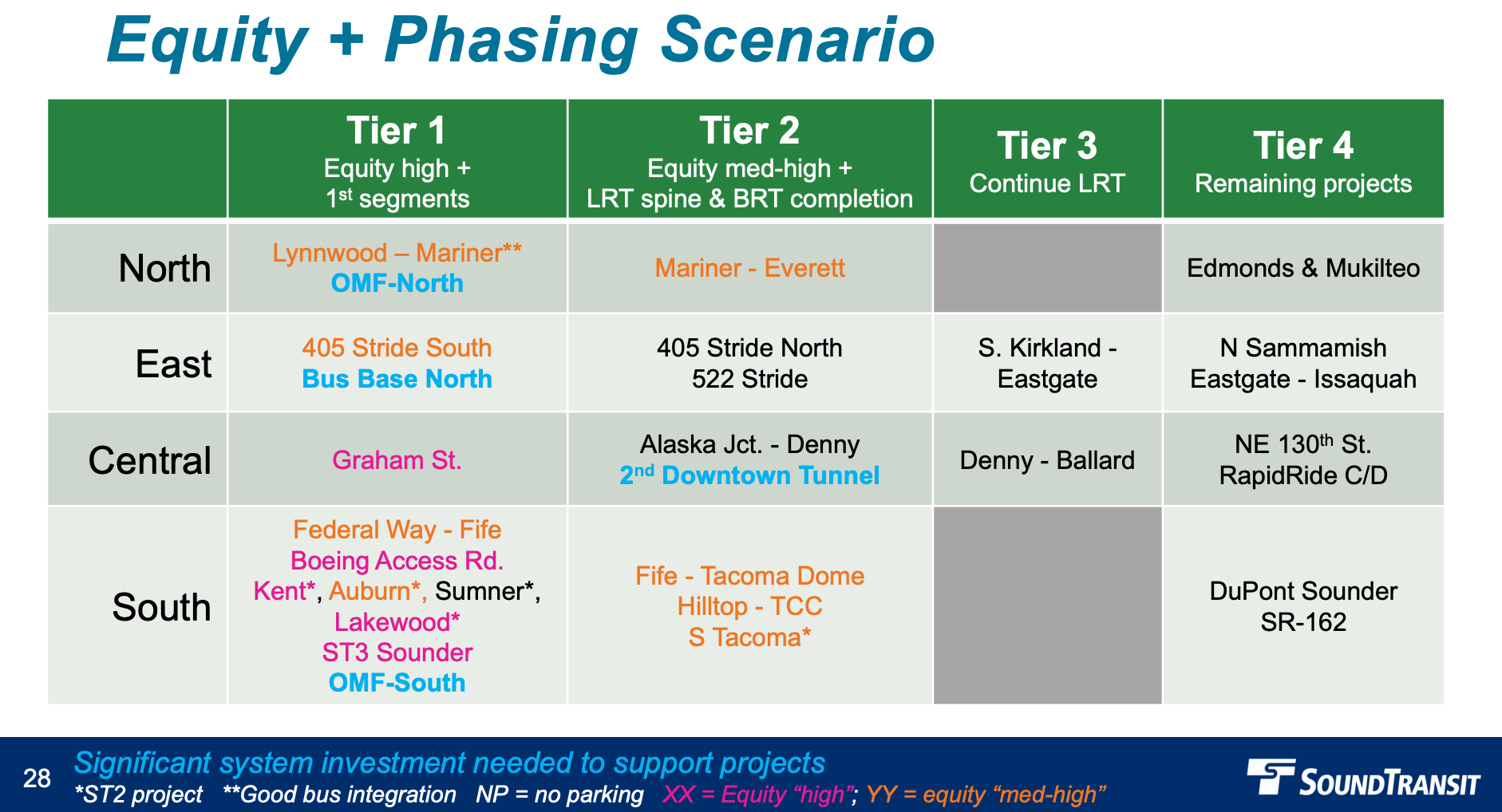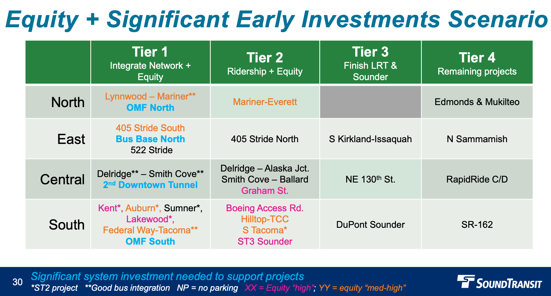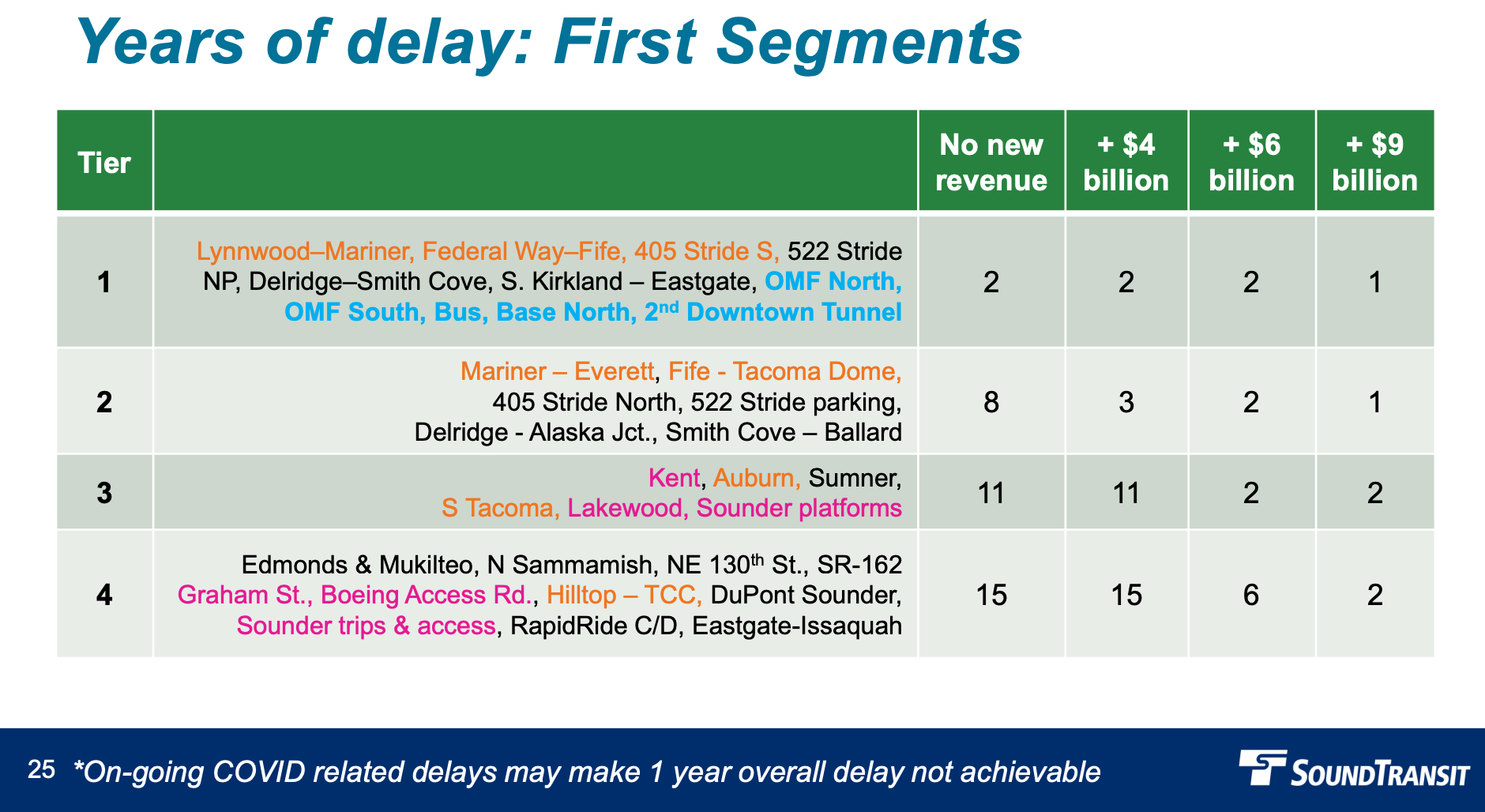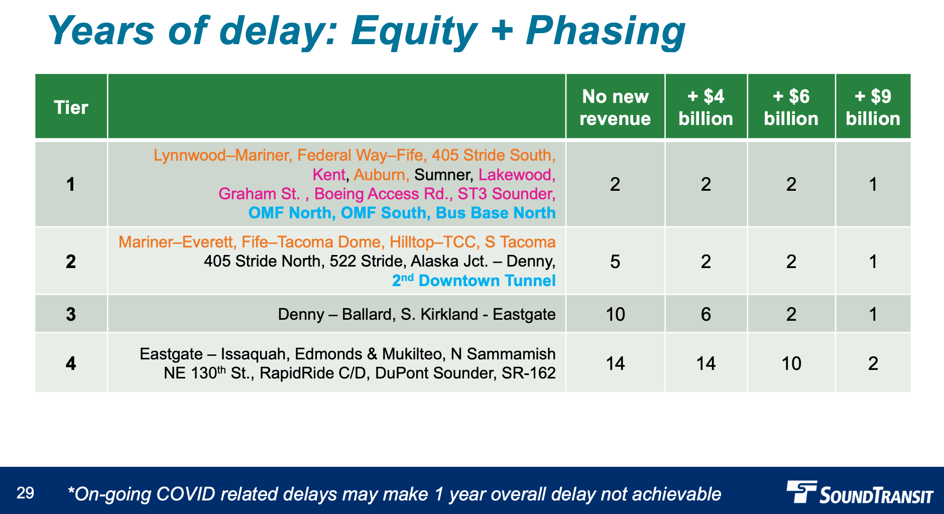 At a briefing to the board last week, agency staff presented several additional illustrative realignment scenarios of the Sound Transit 3 capital expansion program — a similar exercise was conducted in February. These scenarios provide a window into the ways projects can be bundled together and delivered. Based on adopted criteria, projects are packaged into tiers and then ranked by years of delay in relation to original delivery dates. This ranking comes in four varieties, depending upon how much additional financial capacity (e.g., additional federal and state revenue, reduced project scopes, and value engineering) is provided, if any.